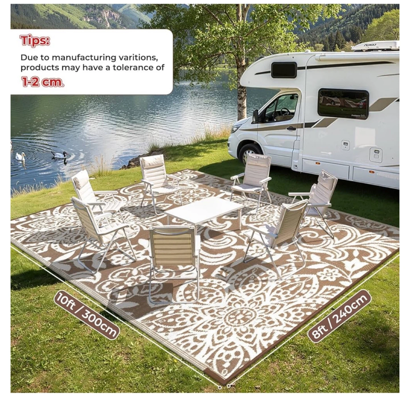 This 8ft x 10ft outdoor area rug features a stylish brown and white floral pattern. It's UV resistant, waterproof, and quick drying for durability. This rug is ideal for patios, decks, or yards.
