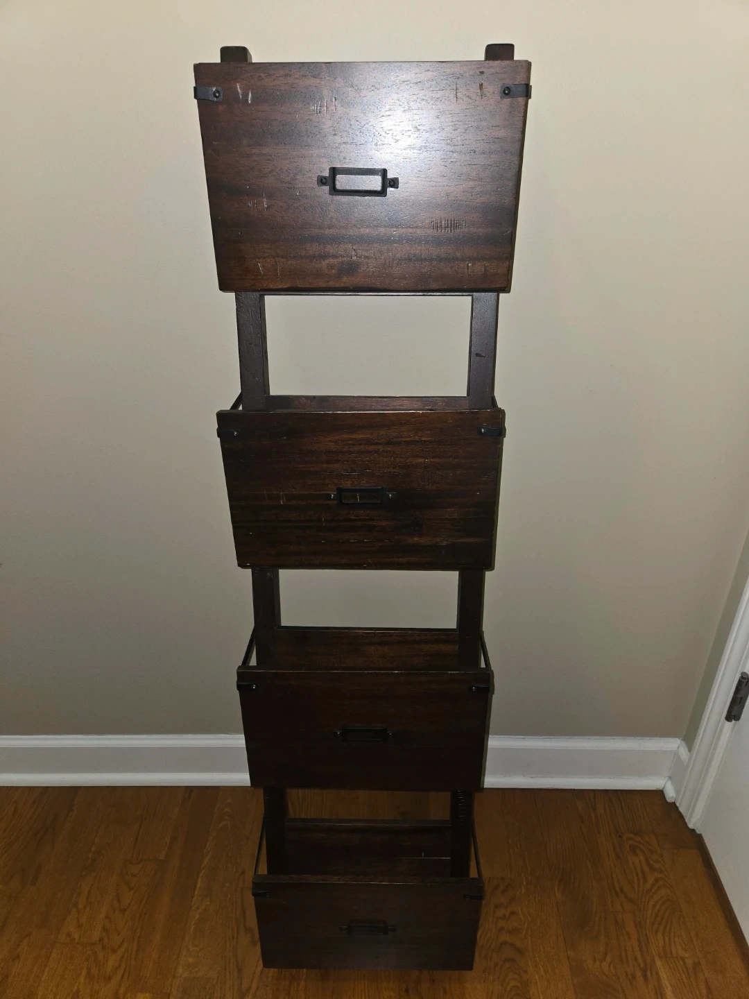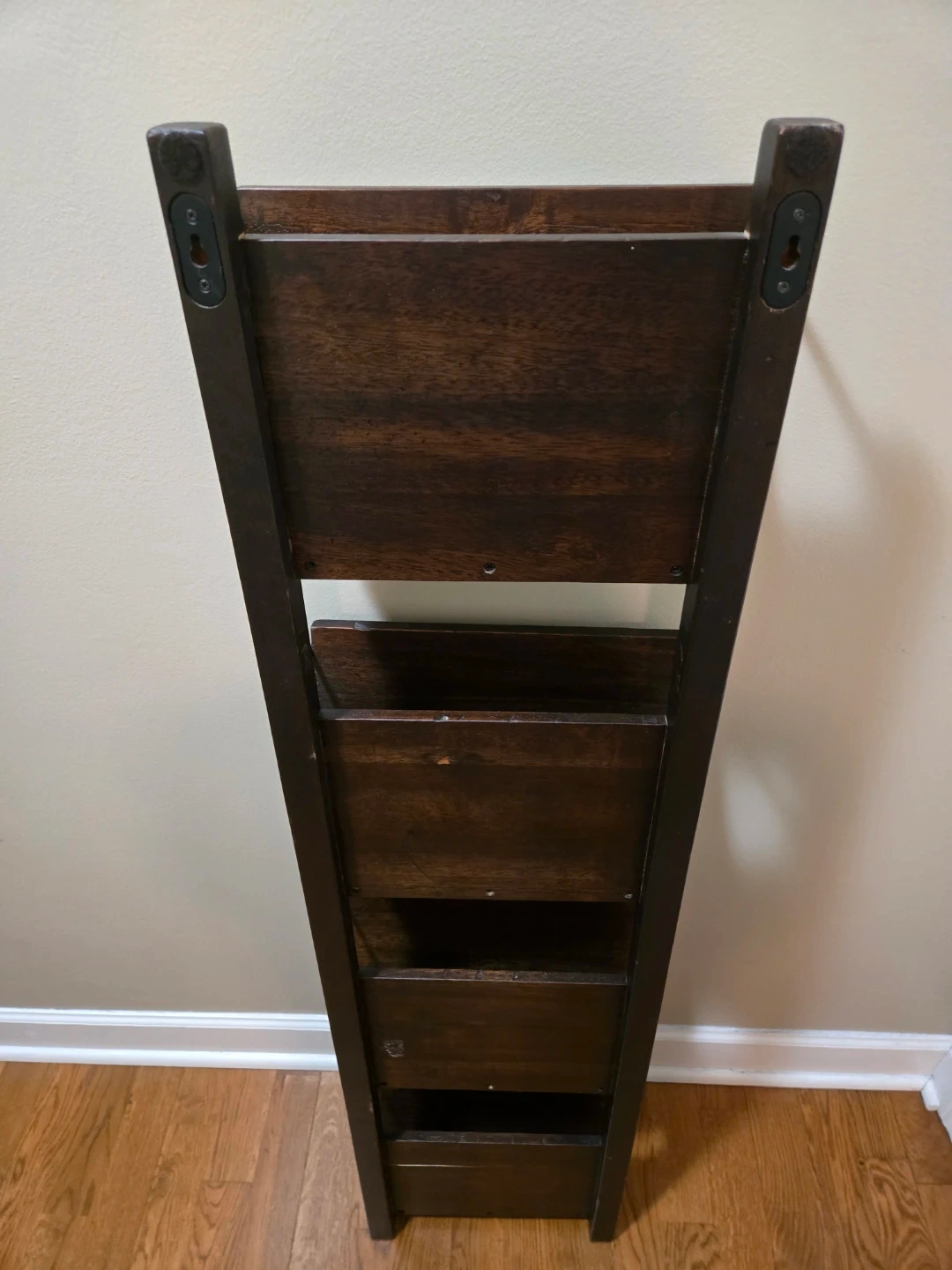 Here is a leaning ladder shelf. It's made of dark wood and has four shelves. It's in good condition and would be perfect for storing books, plants, or other items. This ladder shelf is 4 feet tall, 1 foot wide and 5 1/4 inches deep. Cash and carry only please