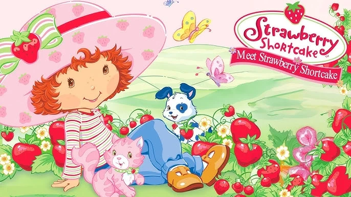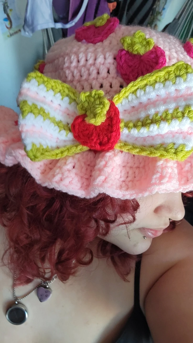 Crocheted strawberry shortcake hat based off of the 2003 strawberry shortcake series.