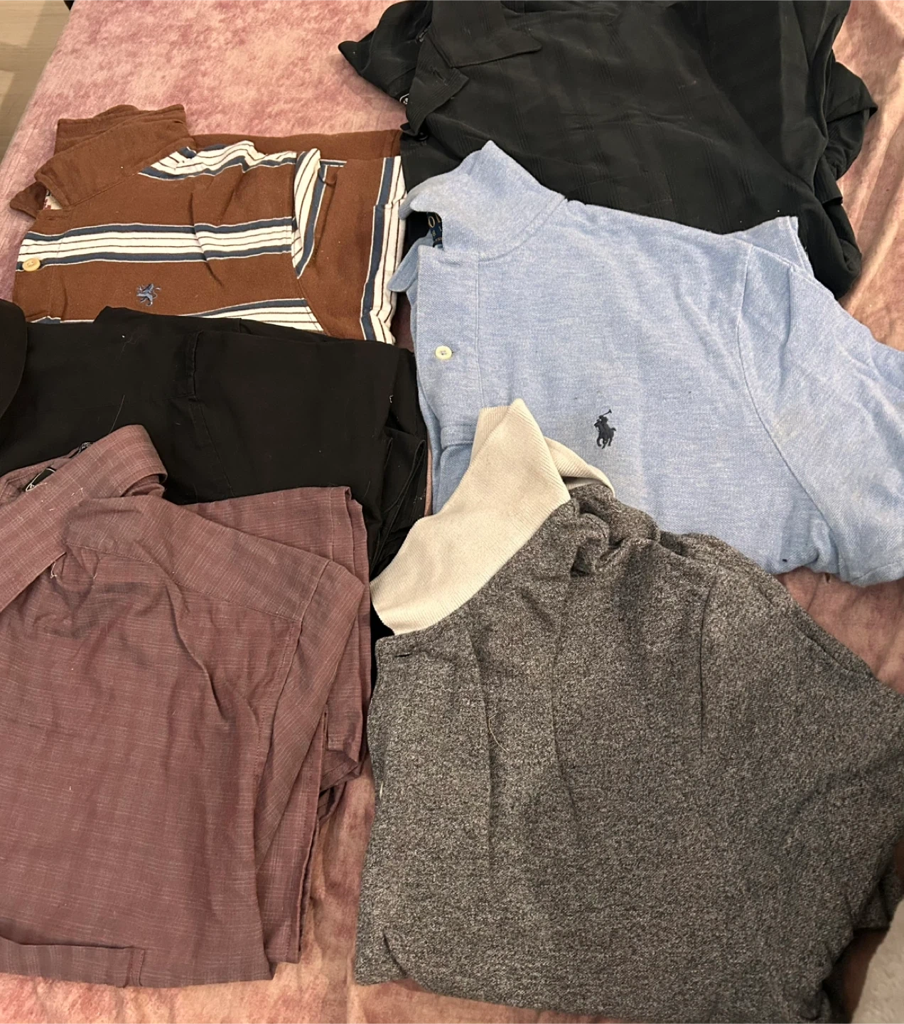 This bundle includes a light blue Polo Ralph Lauren polo shirt with the iconic pony logo. There's also a brown striped polo with a small blue embroidered logo. A dark purple textured button-down shirt and a grey marled short sleeve shirt are also part of the lot. A black button-up shirt completes this collection. These items are great for casual wear or dressing up .