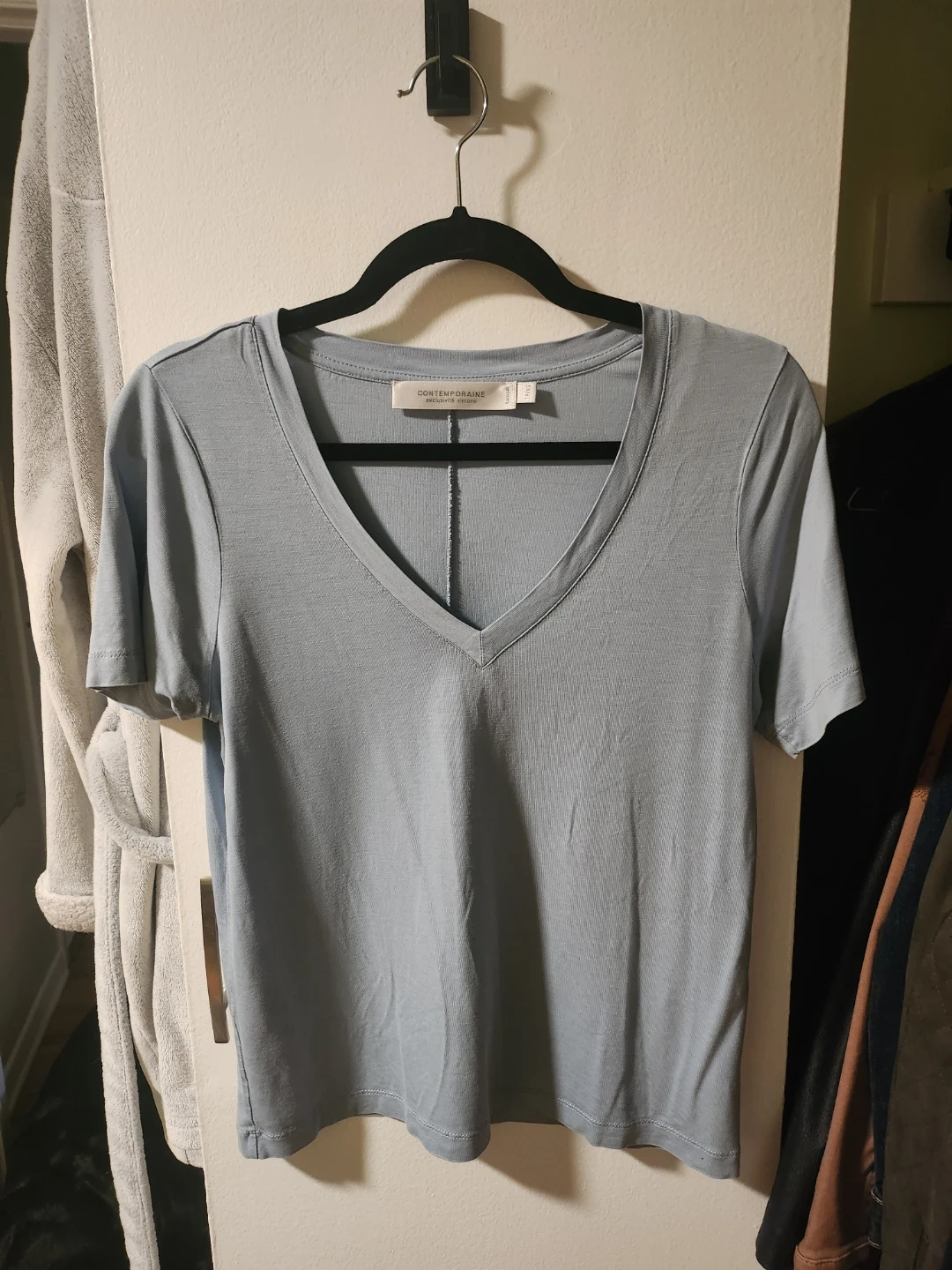 Buy & SellCONTEMPORAINE V-Neck T-ShirtCONTEMPORAINE V-Neck T-Shirt$5CONTEMPORAINE v-neck t-shirt in a soft blue. Xs fits like medium. Short sleeves. Really soft fabric. ConditionLike newSizemedium WHERE TO MEETCheck LocationView MapSELLERMichelleLeslie Park644 reviews0 chats·0 favorites·3 viewsSEND CHAT TO SELLERHi Michelle! I’m interested in your listing.Hi Michelle! I’m interested in your listing.Get the Karrot app to chatSign In to chat