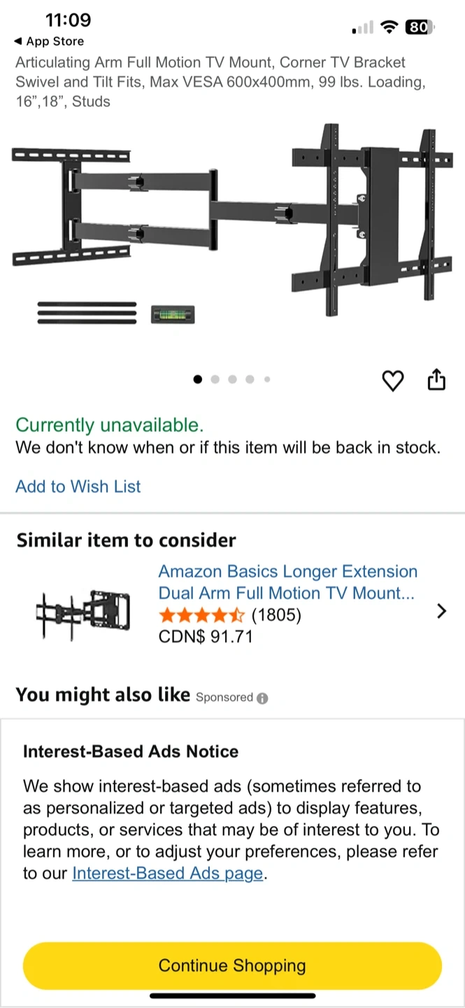 This articulating TV mount offers full motion with swivel and tilt capabilities. It supports a max VESA of 600x400mm and a loading capacity of 99 lbs. It's designed for 16" and 18" studs.