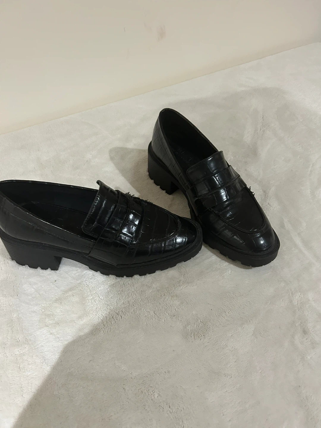 Chic black loafers with a crocodile texture. They're a stylish addition to any wardrobe. Features a lug sole for added grip and a comfortable fit. Bought in UK. Worn once.