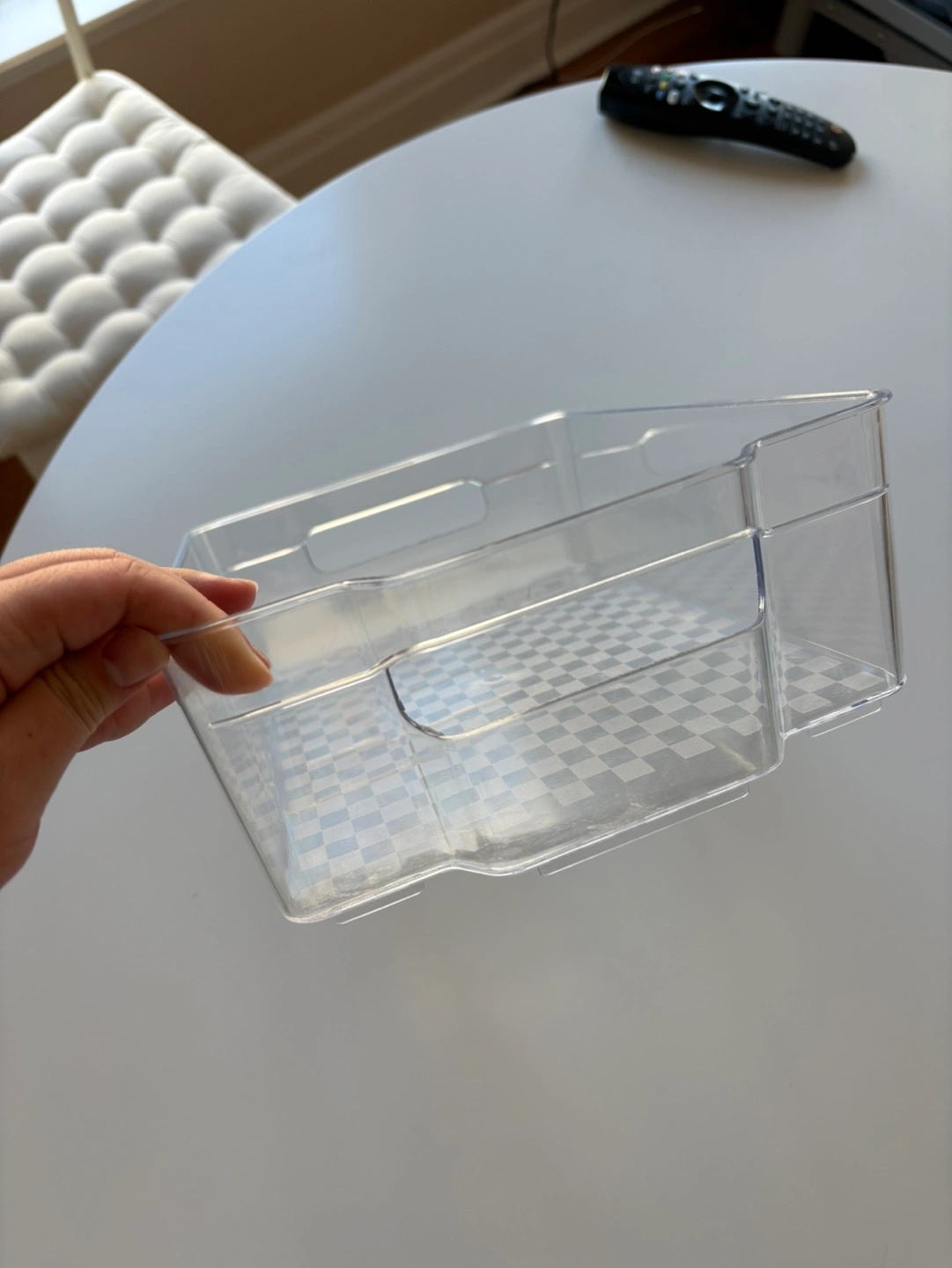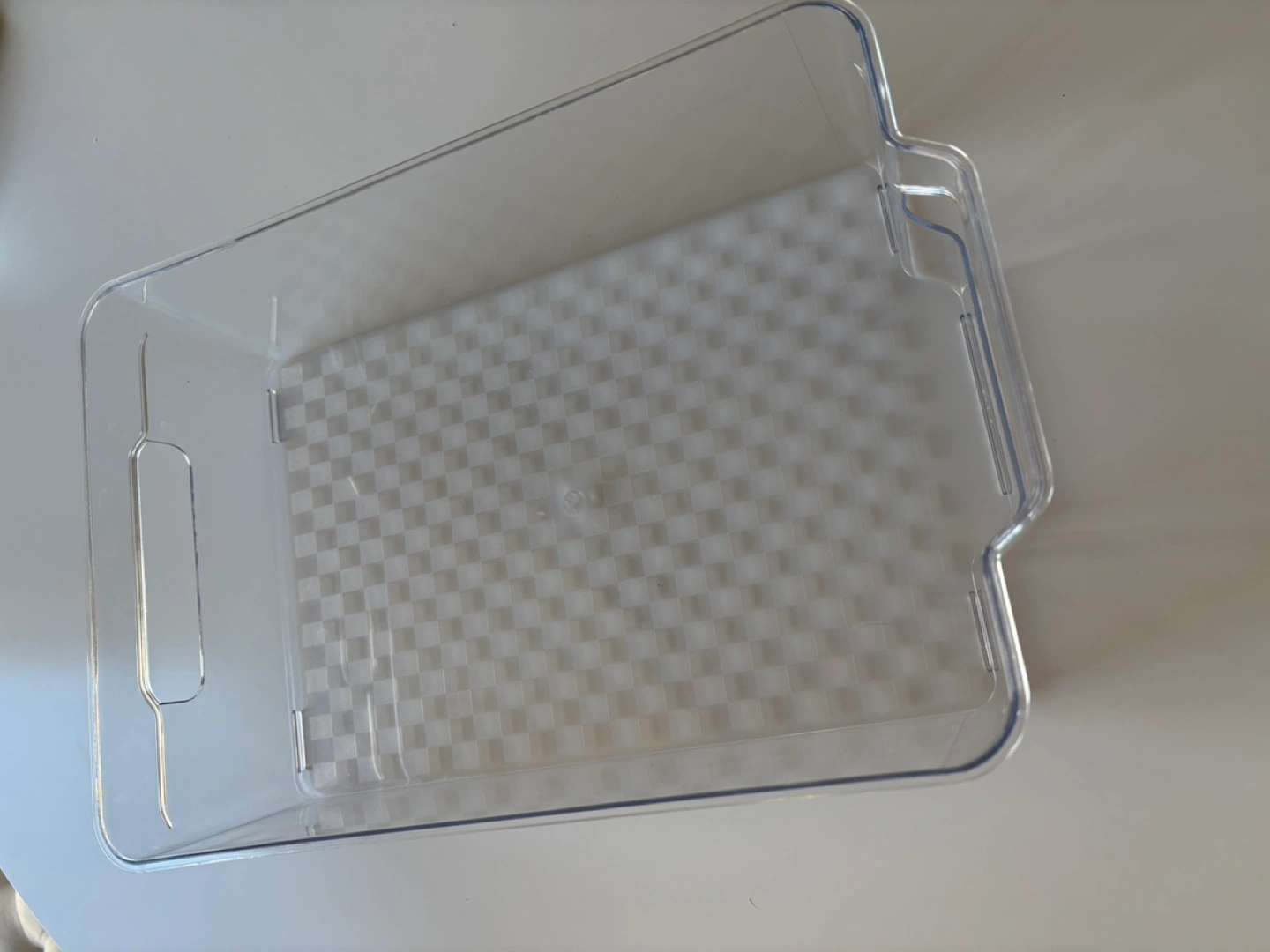 Four clear plastic storage bins. Great for organizing refrigerators or pantries. Checkered pattern on the bottom. Lightweight and easy to clean.