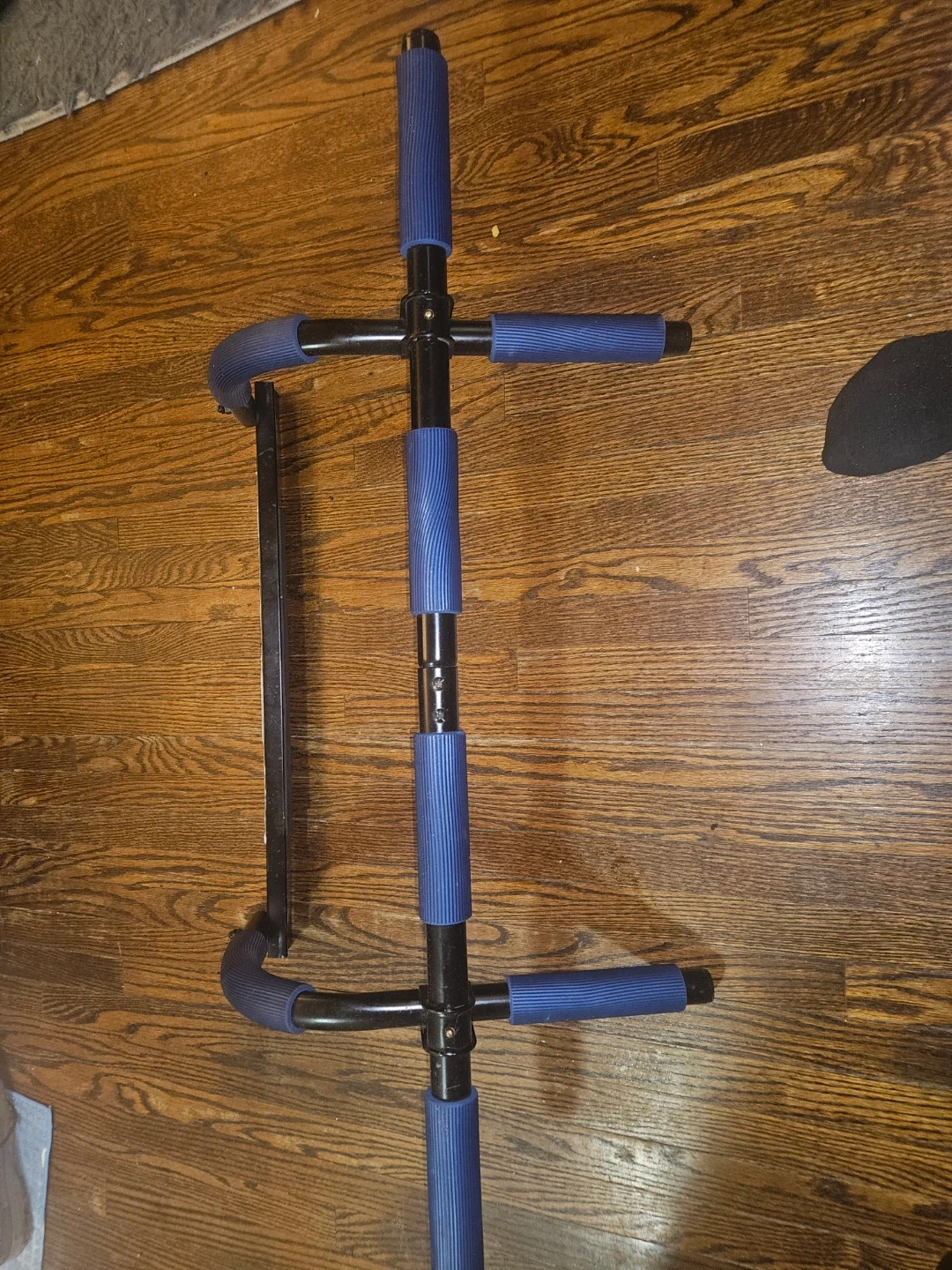 This doorway pull-up bar features padded blue grips for comfort. It's designed for easy assembly and use in most standard doorways. Also great for push-ups on the floor!