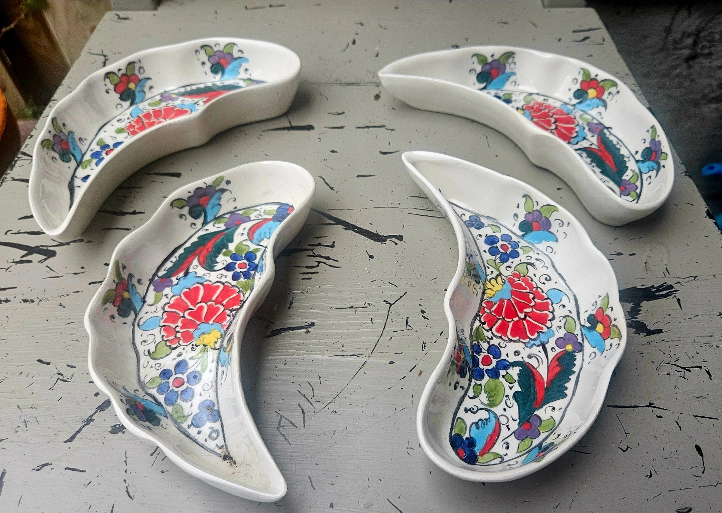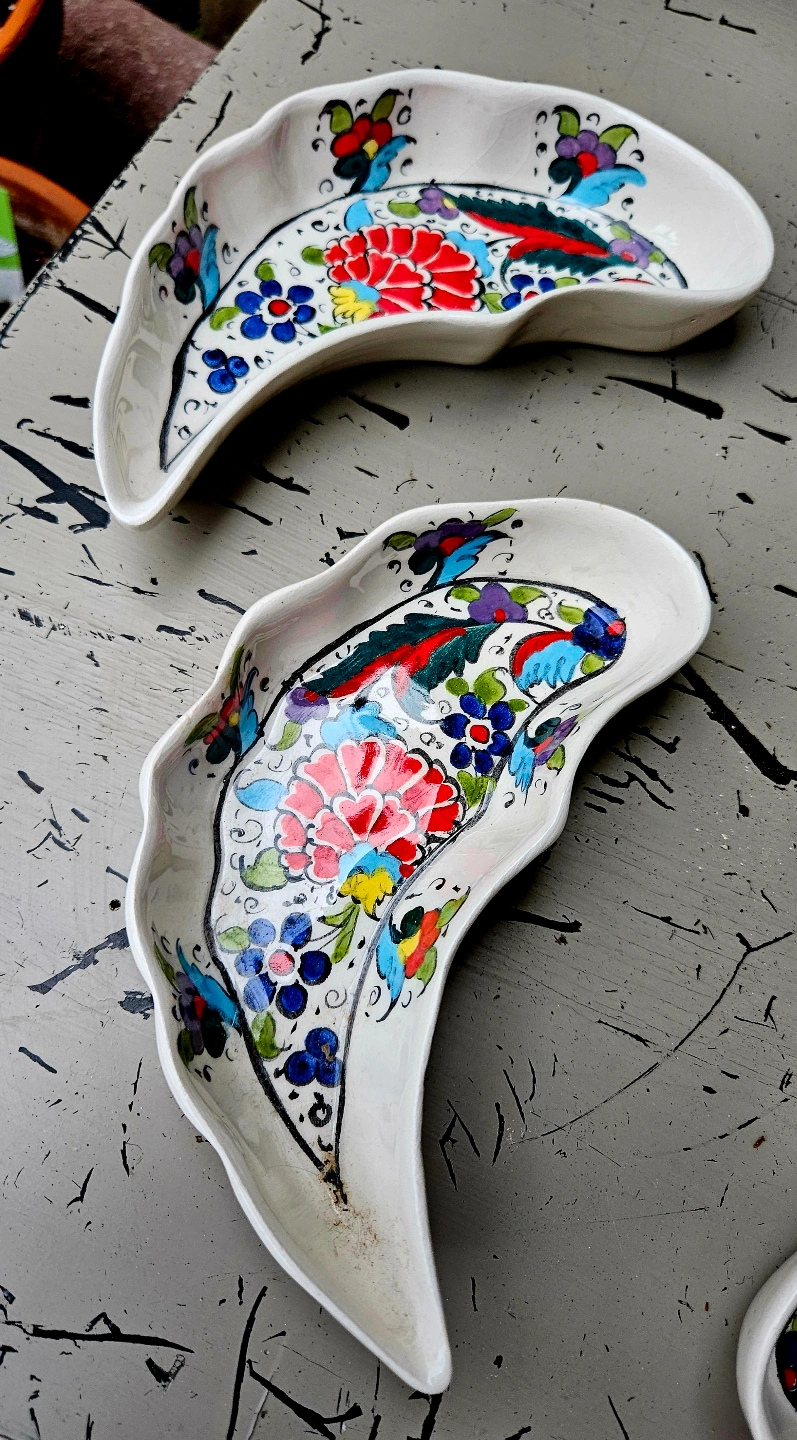 Hand-painted ceramic dishes. Crescent moon shape. Floral patterns. Vibrant colours. Unique design. Perfect for serving or display.