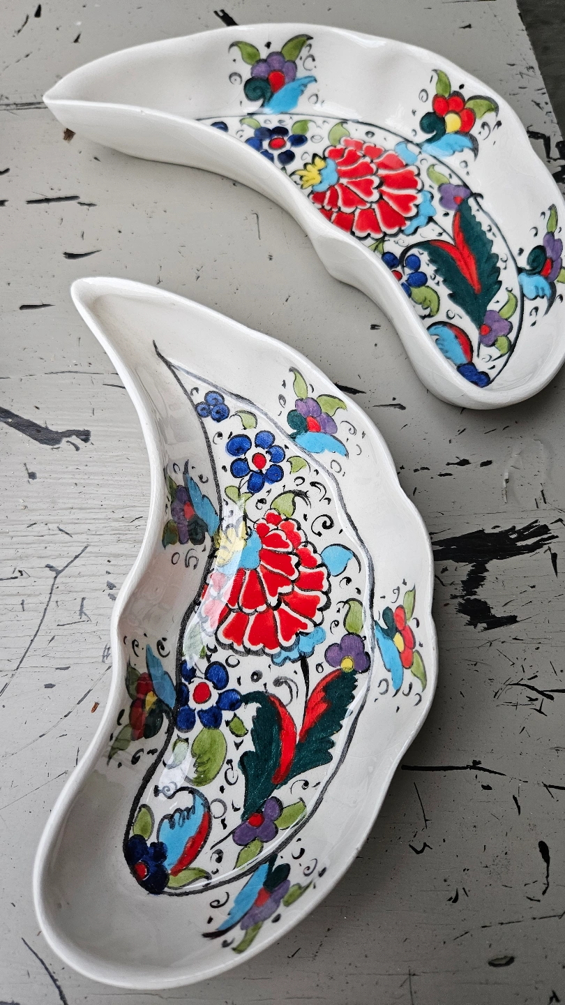 Hand-painted ceramic dishes. Crescent moon shape. Floral patterns. Vibrant colours. Unique design. Perfect for serving or display.