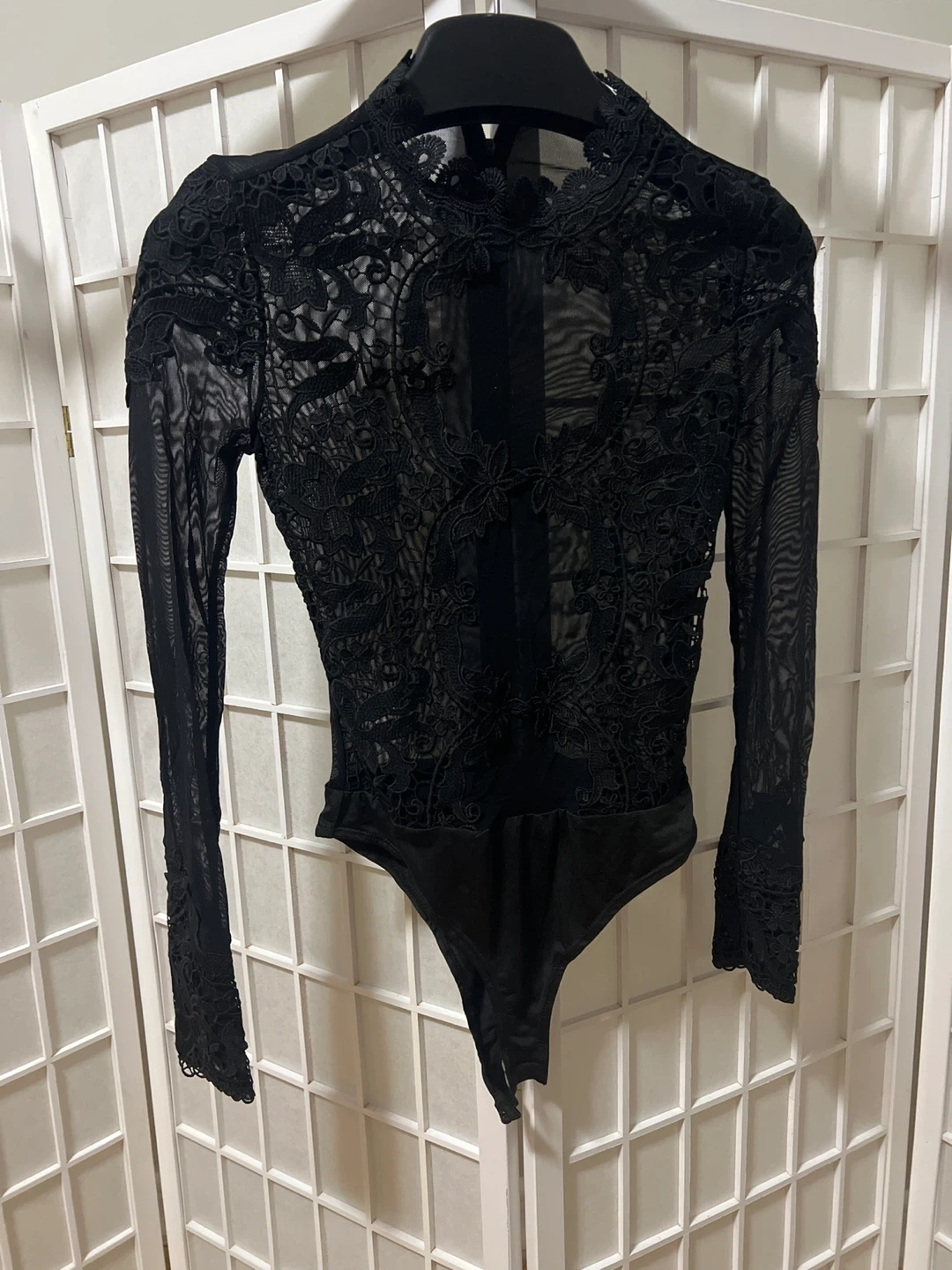 A stunning black lace bodysuit with long sleeves. It features a high neckline and intricate floral lace detailing throughout. Perfect for layering or as a statement piece on its own!