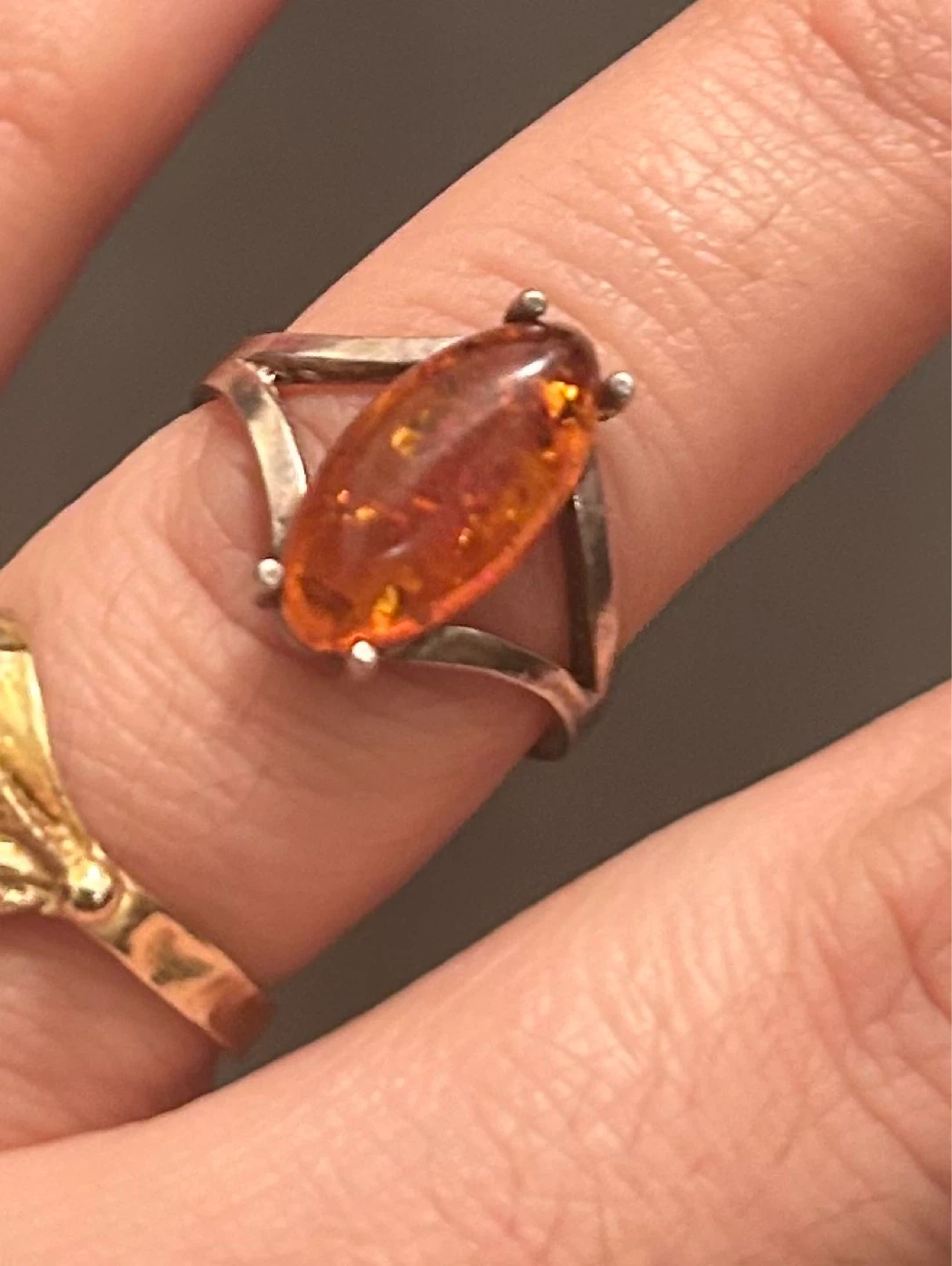 A vintage sterling silver ring featuring a captivating oval amber stone. The stone's rich, warm tones and internal inclusions are beautiful. It's set in an open-back sterling silver band, offering a unique, adjustable fit. This piece adds a touch of natural elegance to any outfit!