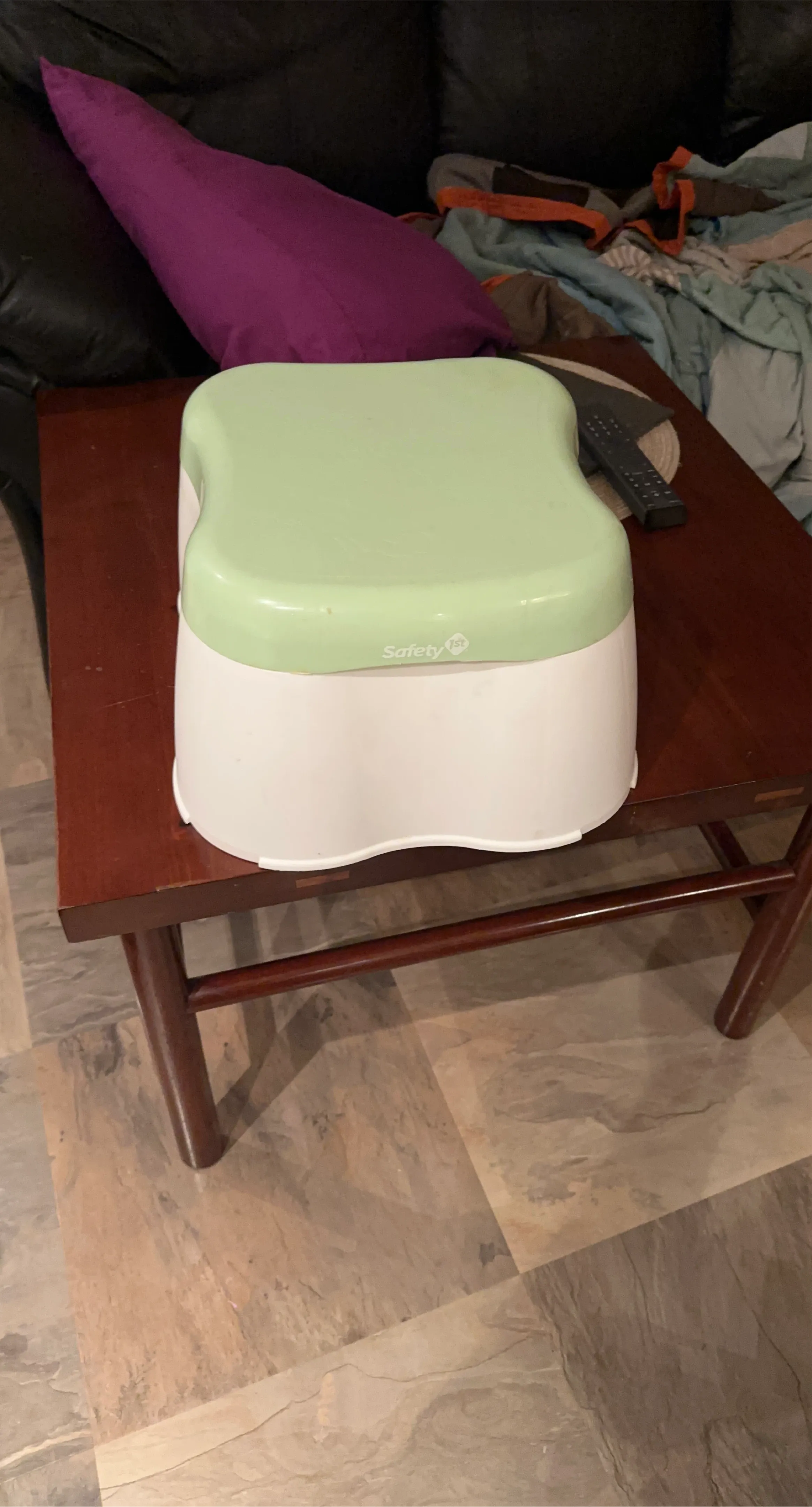 This white and green Safety 1st step stool/ training potty has two levels for little ones to reach the sink or toilet. It's made of durable plastic. Perfect for helping toddlers gain independence during potty training!