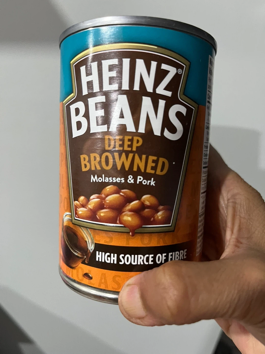 Heinz Deep Browned Beans are made with molasses and pork. It's a high source of fibre. This can is great for quick meals.