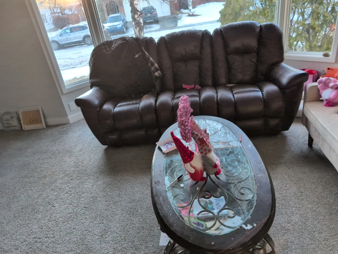 Comfortable brown leather reclining sofa. It's a three-seater with plush cushions. Made with durable leather material. Perfect for relaxing in your living room!