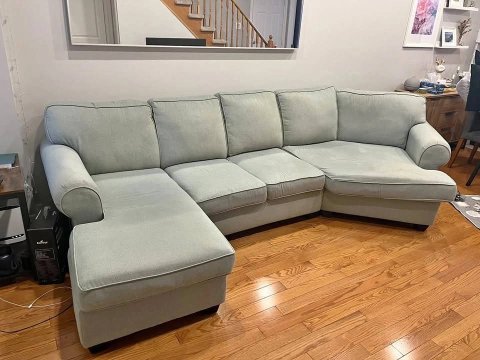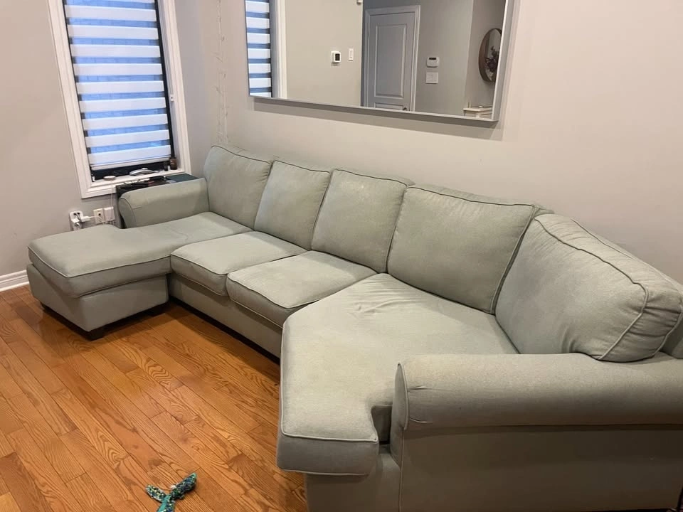 Very comfy sofa with durable fabric. Cushion covers come off for easy washing. Appx. 11 feet by 63 inches. Pick up only. Dog friendly home.