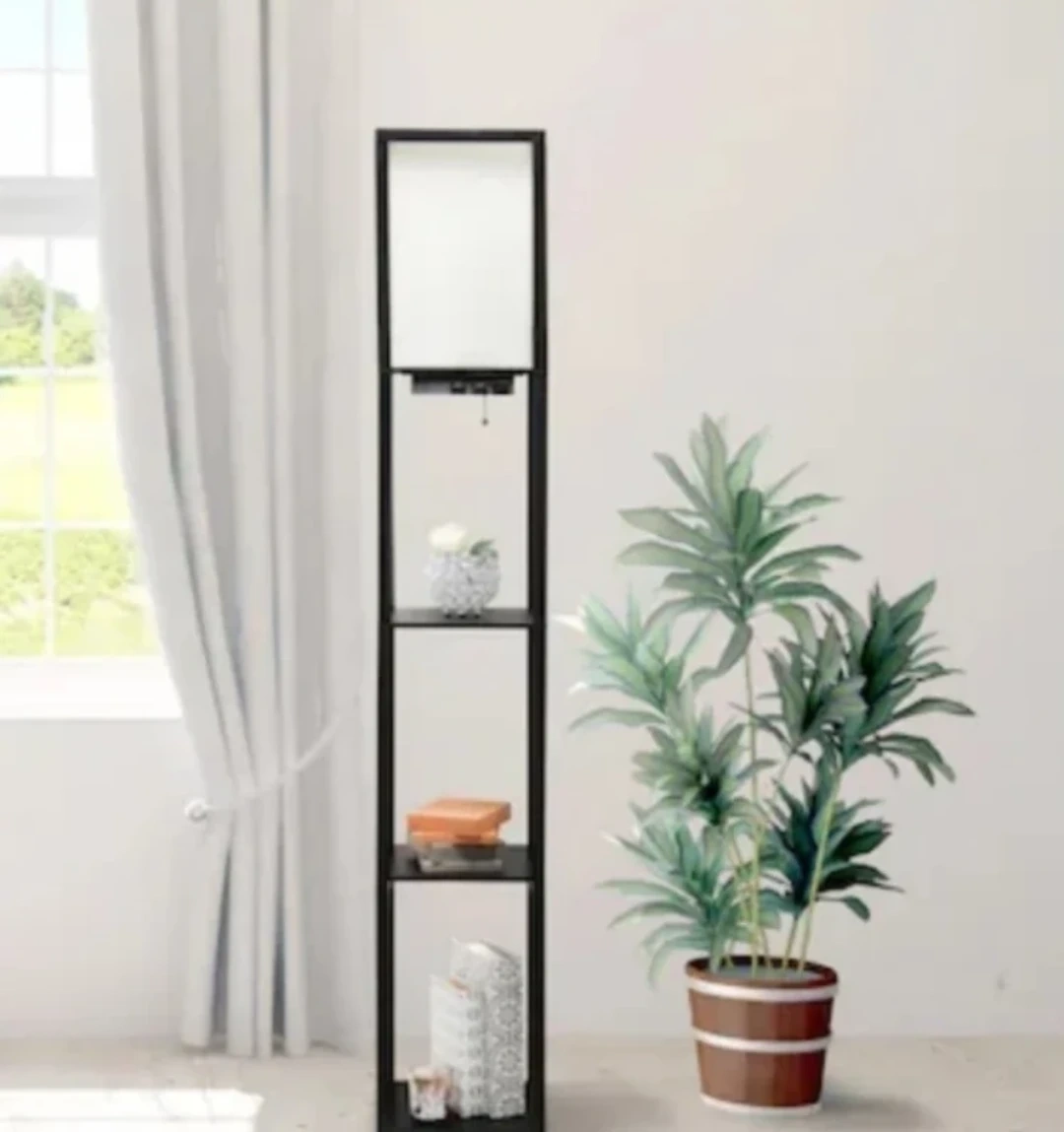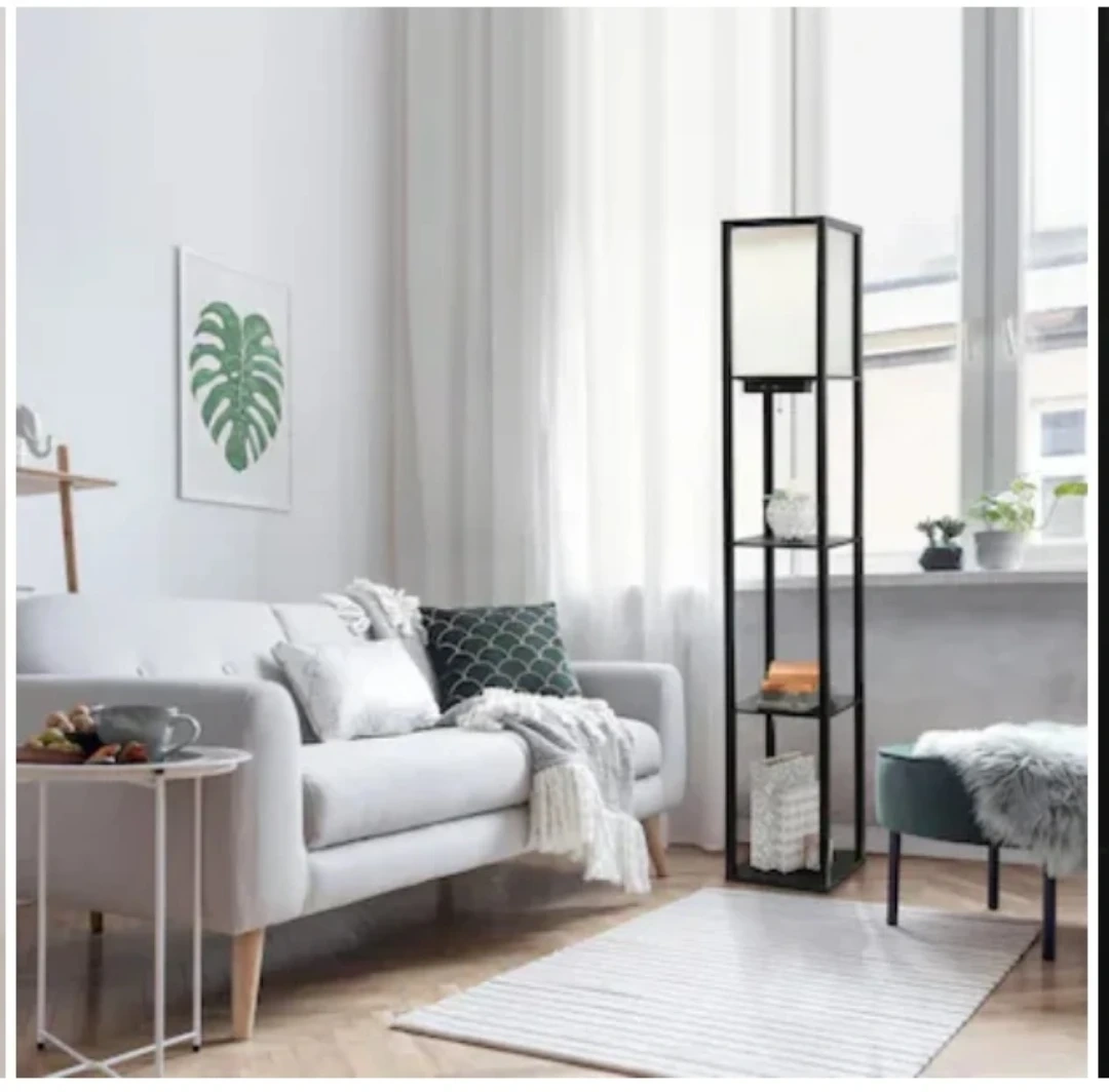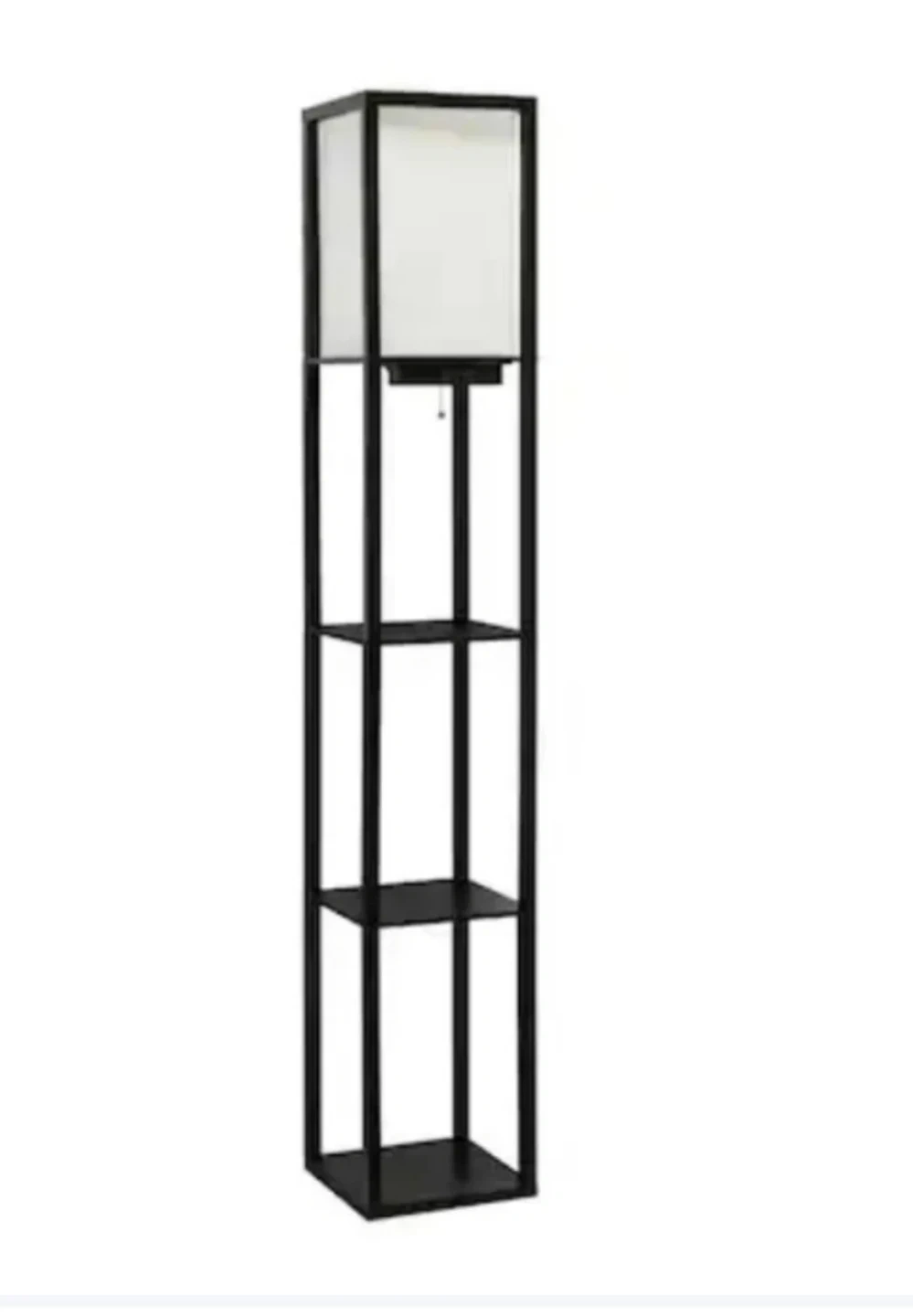 Selling a Simple Designs 62.5-inch Black Shelf Floor Lamp with Linen Shade. This stylish floor lamp features shelves for storage or display. It's a great way to add light and functionality to any room!
