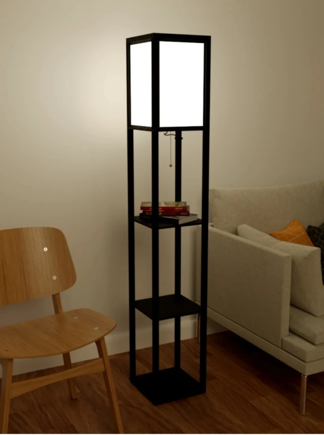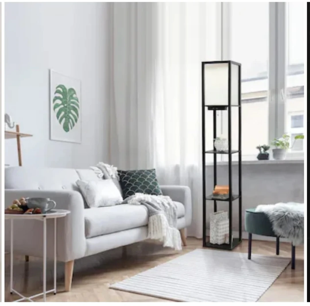 Selling a Simple Designs 62.5-inch Black Shelf Floor Lamp with Linen Shade. This stylish floor lamp features shelves for storage or display. It's a great way to add light and functionality to any room!