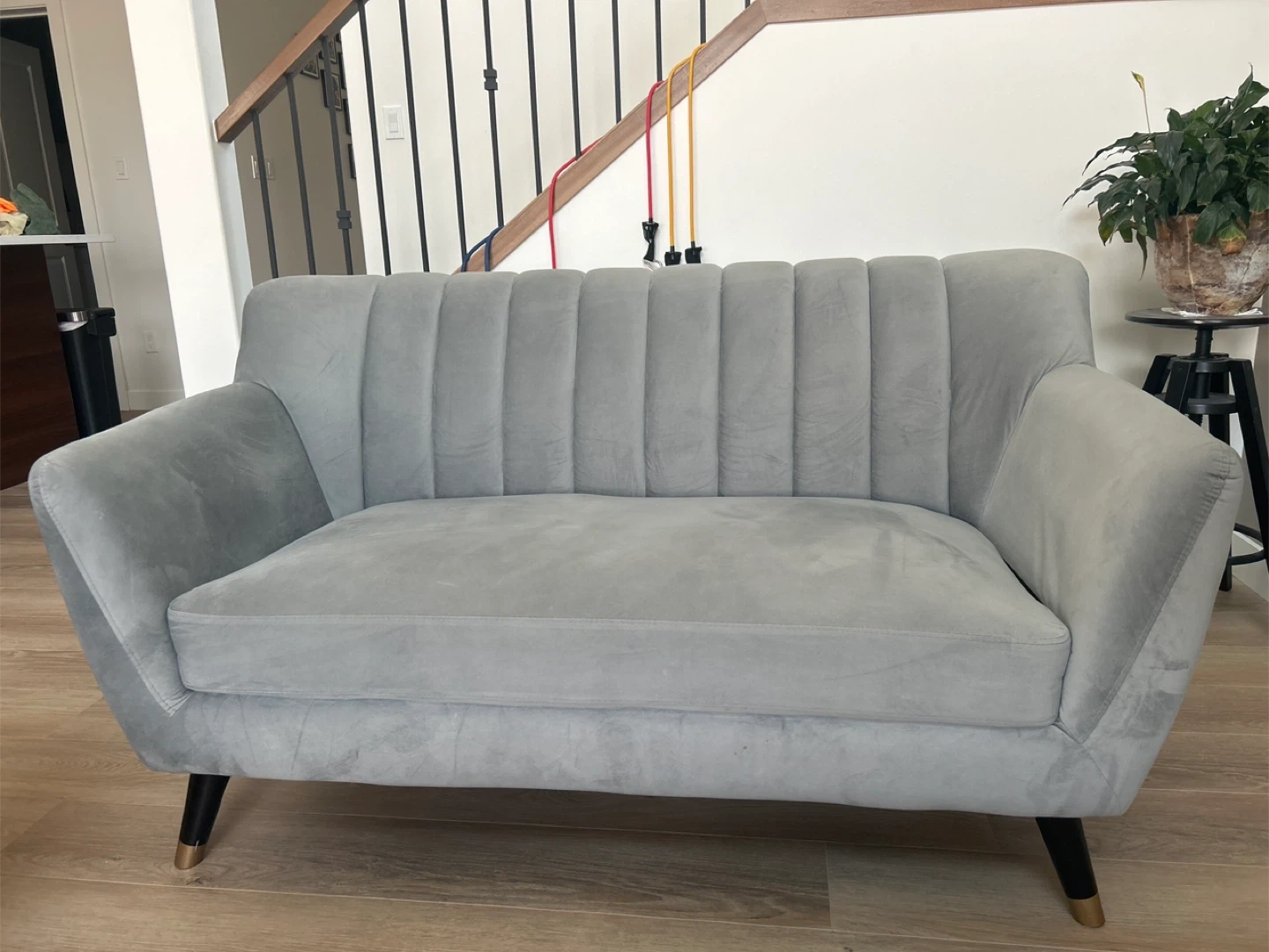 Selling a stylish grey loveseat sofa. It's in great condition and would be a lovely addition to any living room or seating area! Purchased a couple of years ago for $3500.
