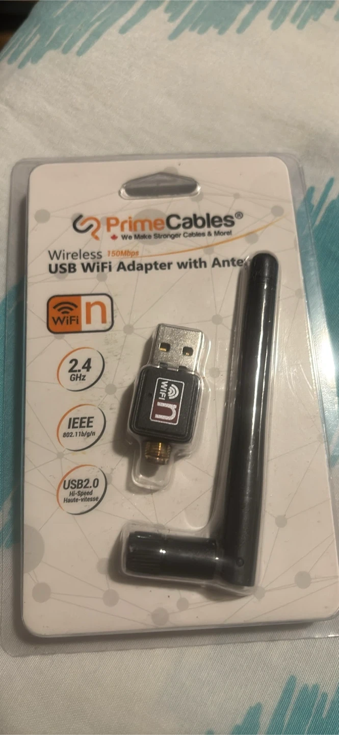 Selling a brand new Prime Cables Wireless 150Mbps USB WiFi Adapter with Antenna. It supports 2.4 GHz WiFi, IEEE 802.11b/g/n, and USB 2.0 High-Speed.