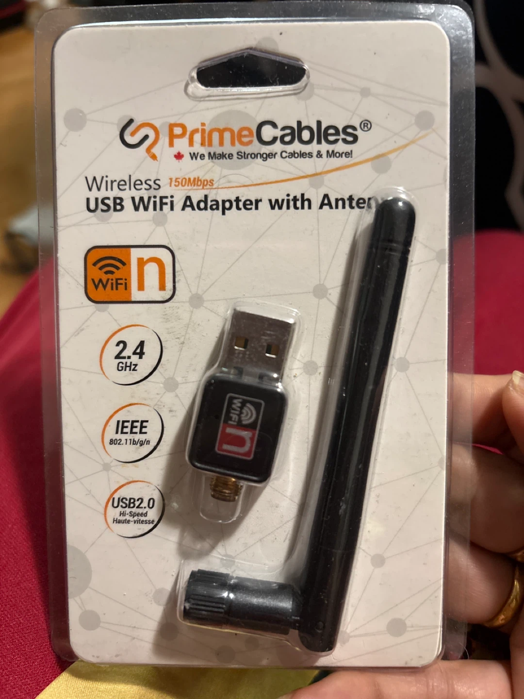 Selling a brand new Prime Cables Wireless 150Mbps USB WiFi Adapter with Antenna. It supports 2.4 GHz WiFi, IEEE 802.11b/g/n, and USB 2.0 High-Speed.