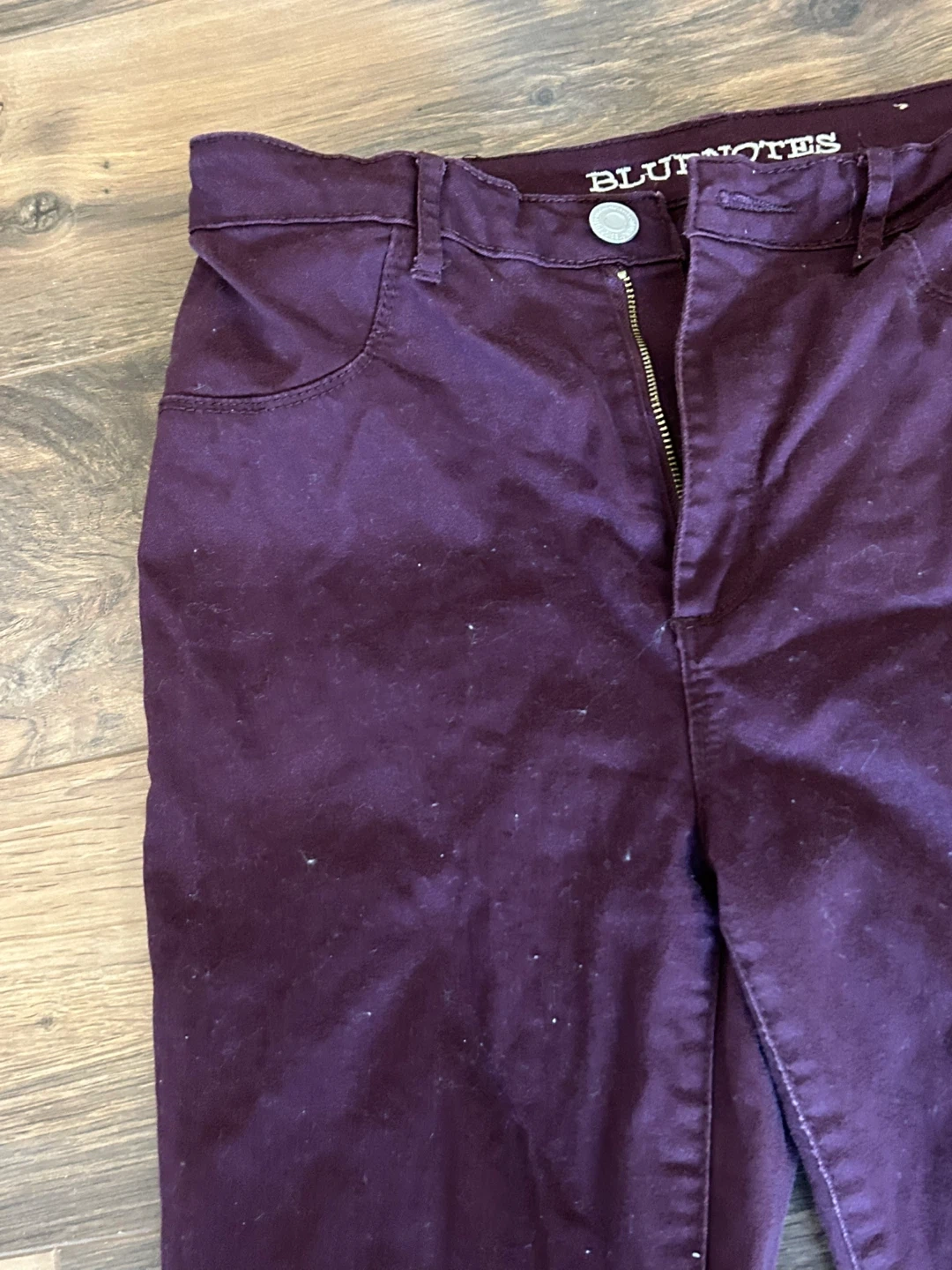 Blunotes high rise legging jeans in a size 30. They're a rich plum colour. These jeans are made with a comfortable stretch fabric.
