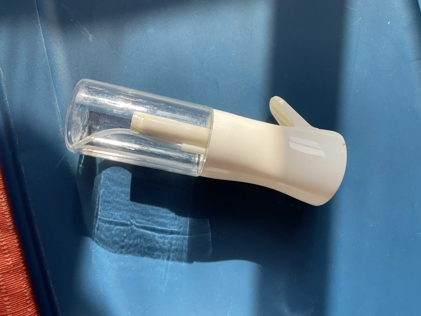 This is a spray bottle for curly hair. It's made of transparent plastic and has a white sprayer. It's great for misting hair evenly.