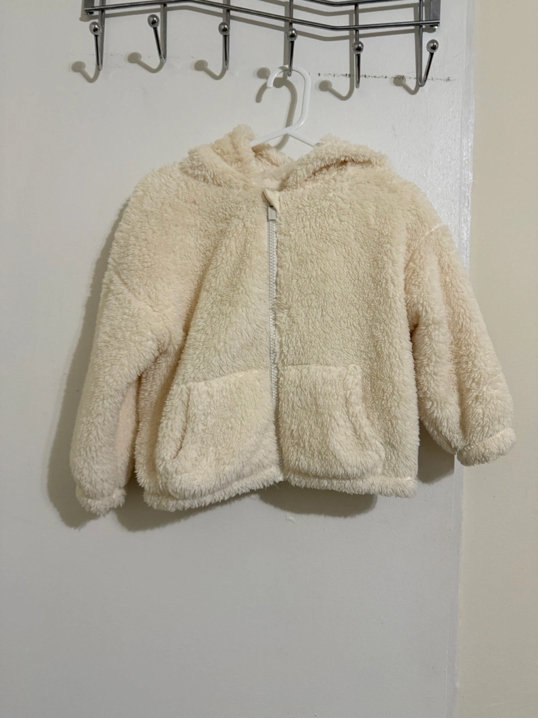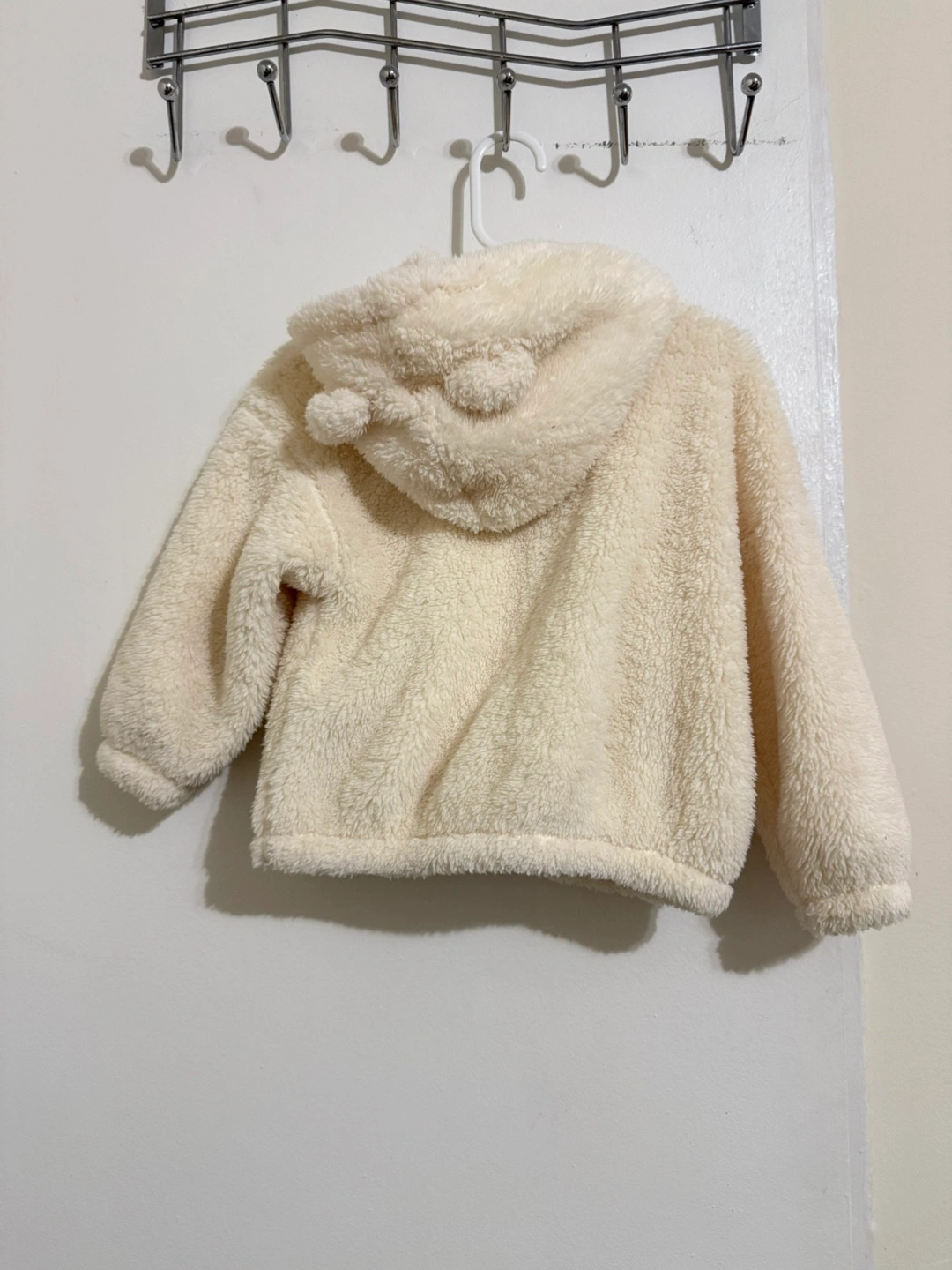 This adorable fuzzy jacket is perfect for keeping your little one warm and cozy! It features a hood with cute bear ears and a soft, plush material. It's in great condition.