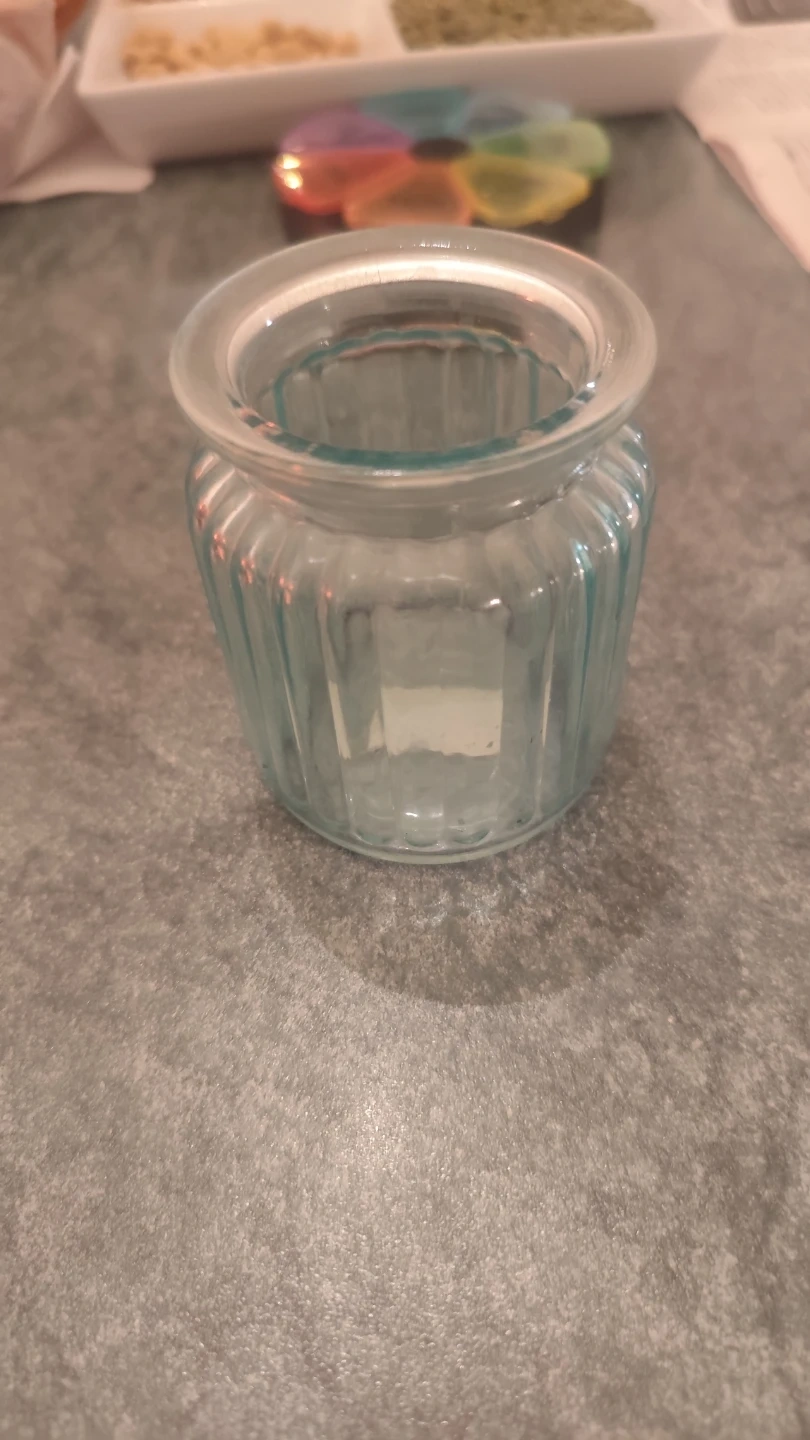 Small glass jar with a ribbed design. Clear glass material. This jar is suitable for holding small items or as a decorative piece. It's empty and ready for use.