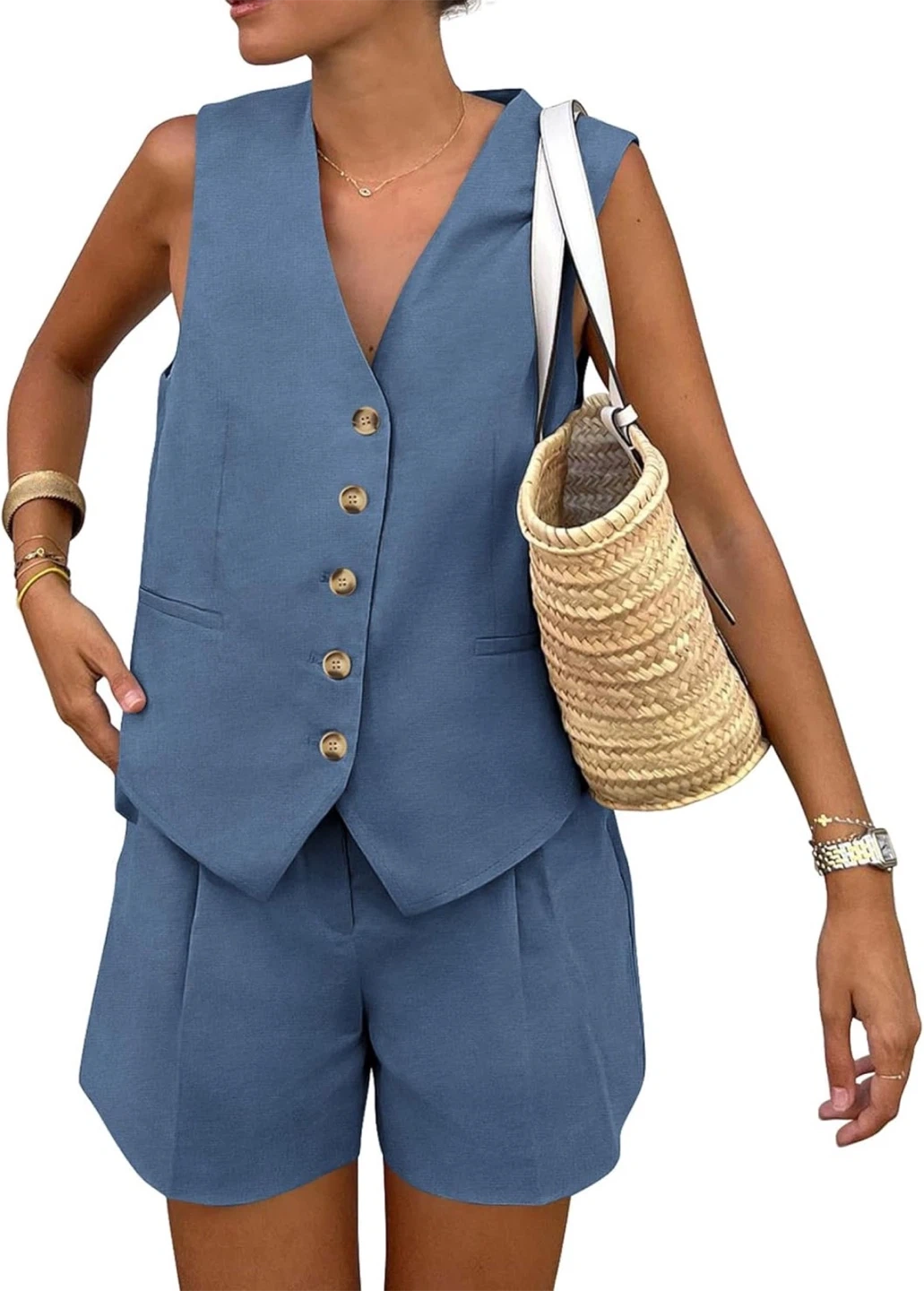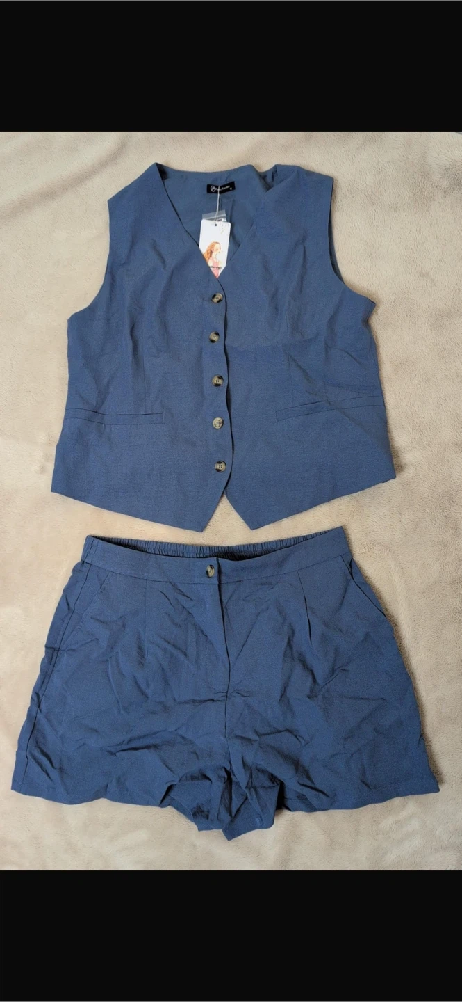 This is a sleeveless vest and matching shorts set in a denim blue colour. The vest has a V-neck and button closure. The shorts feature a pleated front. Linen-look material.
