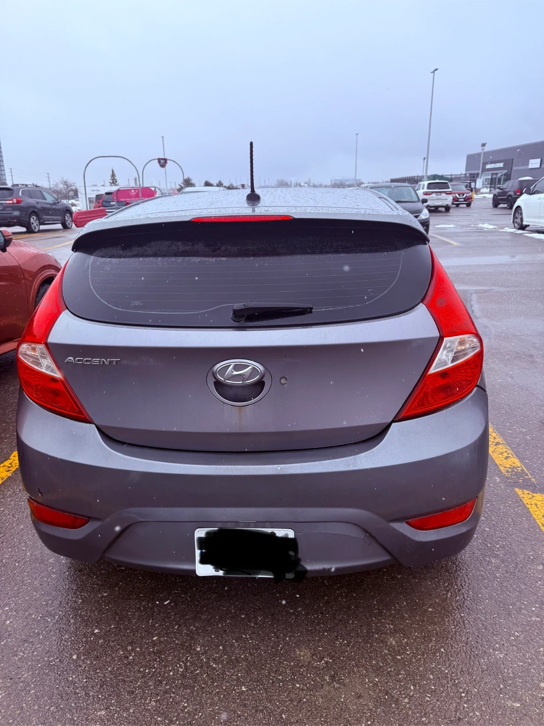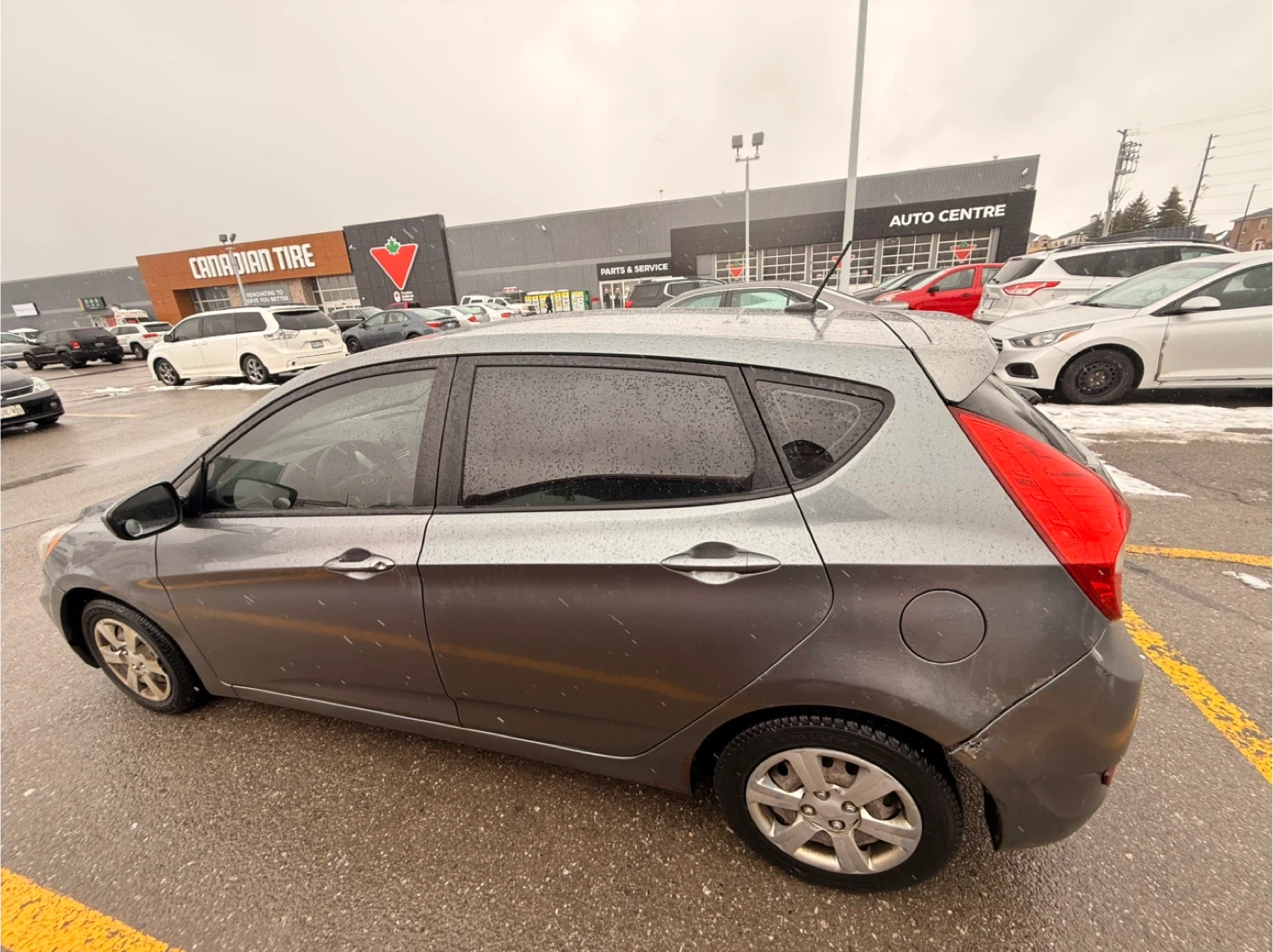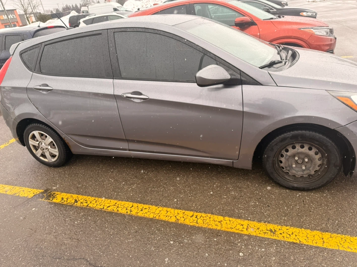 Grey 5-door hatchback by Hyundai. This car is reliable and practical for daily commuting or city driving. It's a great option for a first car or for anyone needing a fuel-efficient vehicle.