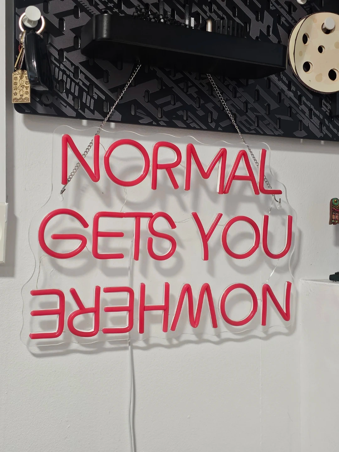 This is a red neon sign that says "Normal Gets You Nowhere". It includes a remote control for brightness adjustment. The sign is mounted on a clear acrylic backing with hanging chains.