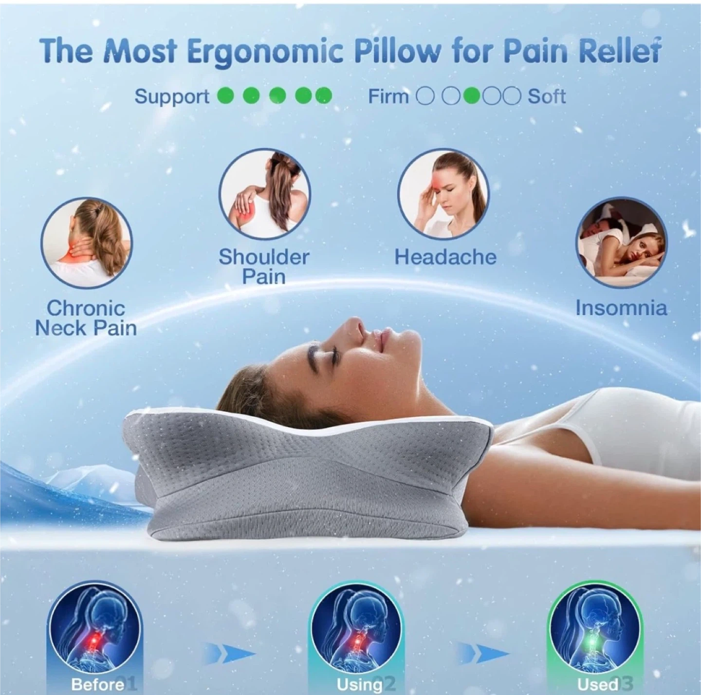 Neck support and sleep aid, enjoy a restful night's sleep! π Ergonomically designed to conform to the natural curvature of the cervical spine, it automatically supports the neck when you lie down, eliminating the feeling of neck strain and leaving your neck feeling incredibly relaxed after sleep! β¨ Zoned support technology with a dual-zone design for both supine and side sleeping positions ensures the cervical spine maintains its normal physiological curvature regardless of your sleeping position, preventing pressure on the face and stuffiness! Breathable and skin-friendly, preventing breakouts, the pillowcase features breathable mesh fabric that stays cool and comfortable even in summer β a dream come true for those who sweat easily. The adjustable height allows you to customize the fit to your sleeping posture and shoulder width, offering lightweight breathability and a soft, skin-friendly feel!