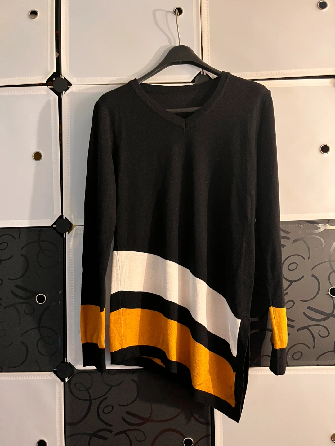 Black long sleeve v-neck sweater with white and mustard yellow colour block accents. It's made from a knit material. This sweater has a unique asymmetrical hemline.