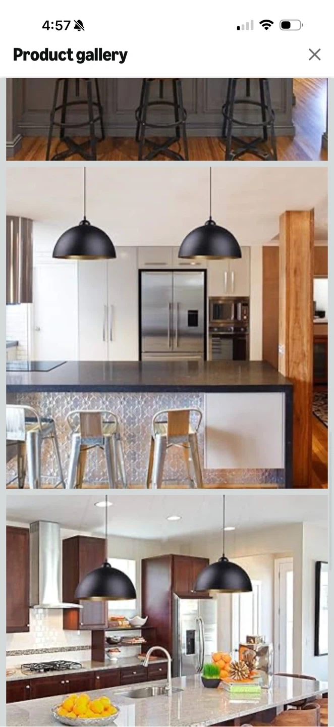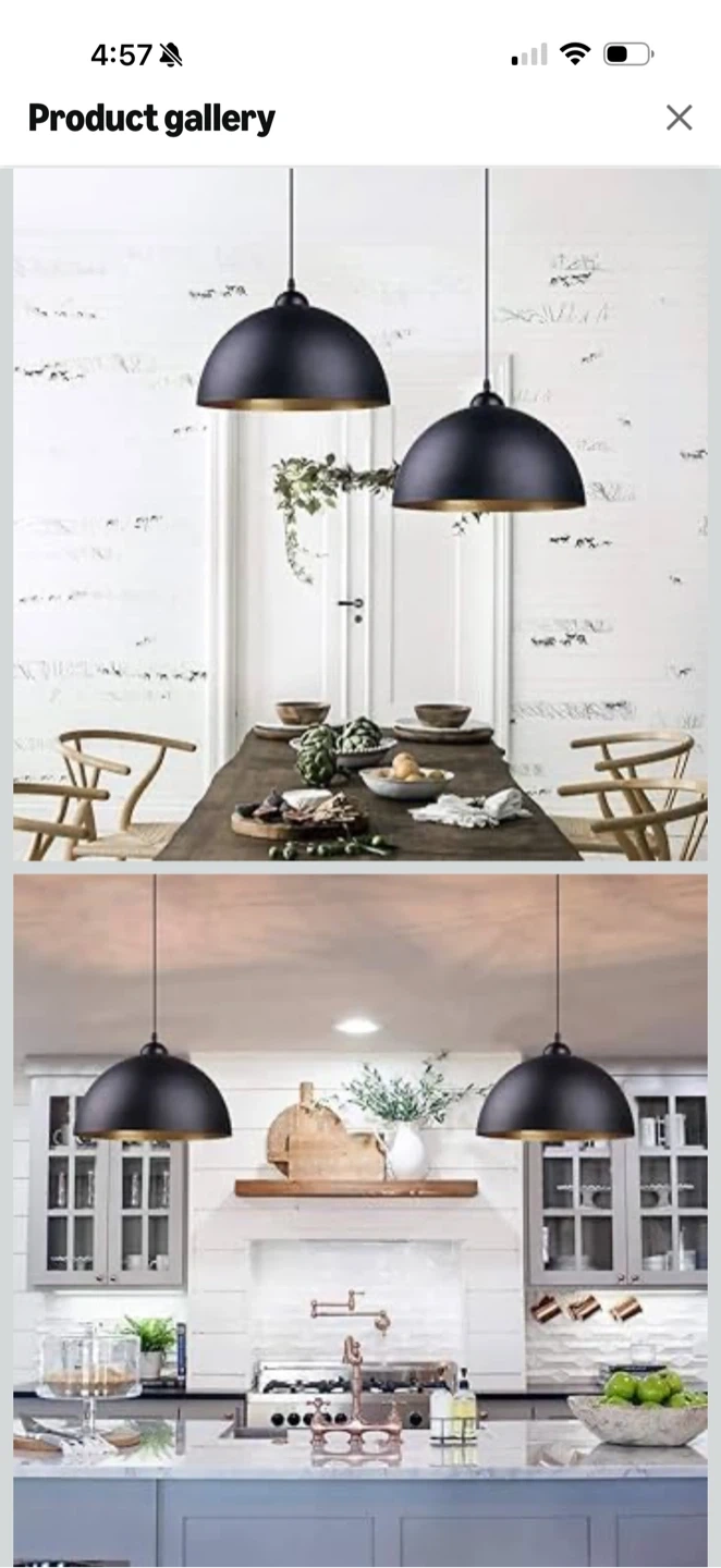 Black dome-shaped pendant light fixture with a metallic gold interior. This fixture offers a classic design suitable for various kitchen or dining room settings. It's designed to be a focal point in your home decor.