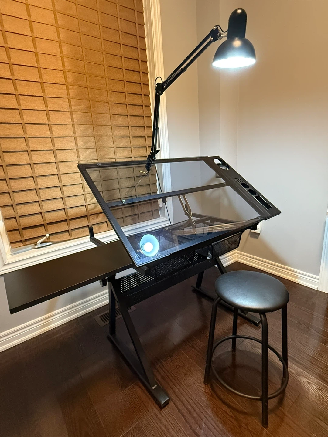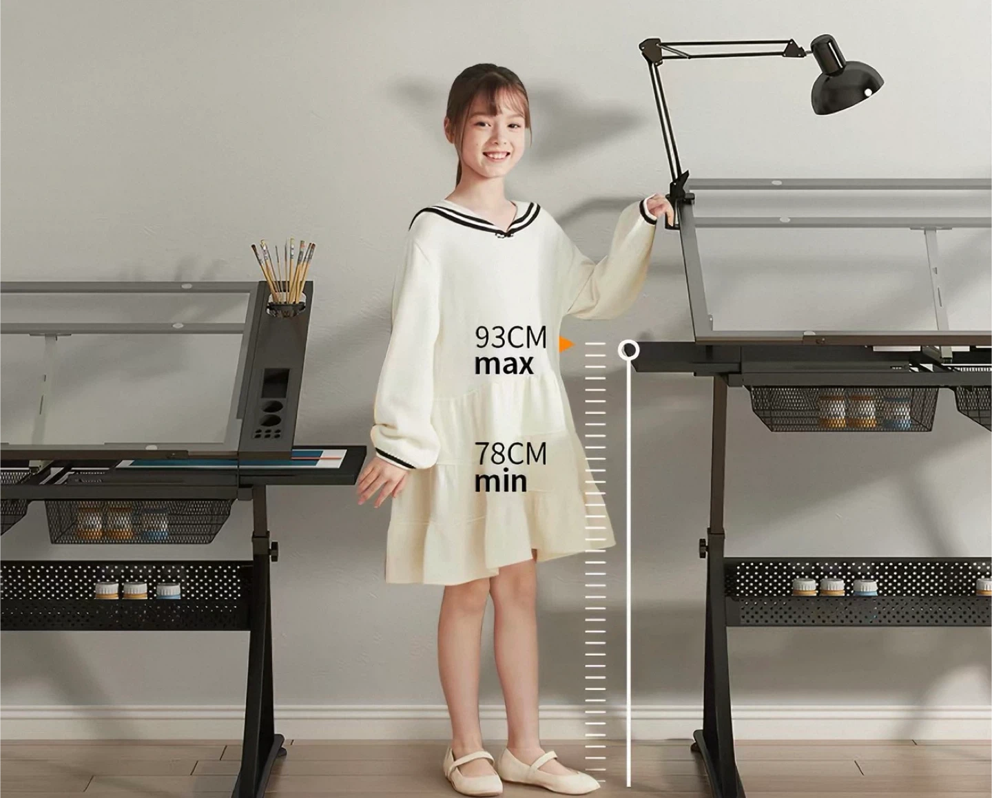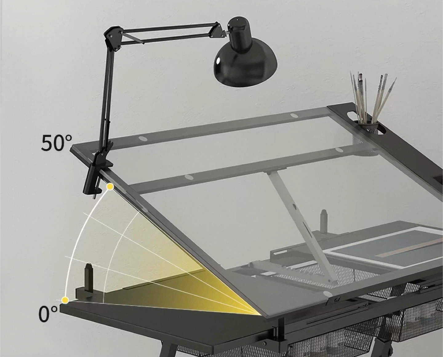 This drafting table features a tempered glass top that can be tilted for your preferred working angle. It includes an adjustable task lamp and a stool for comfortable use. The metal frame offers stability, and mesh storage baskets are built in. A side extension provides extra workspace.
