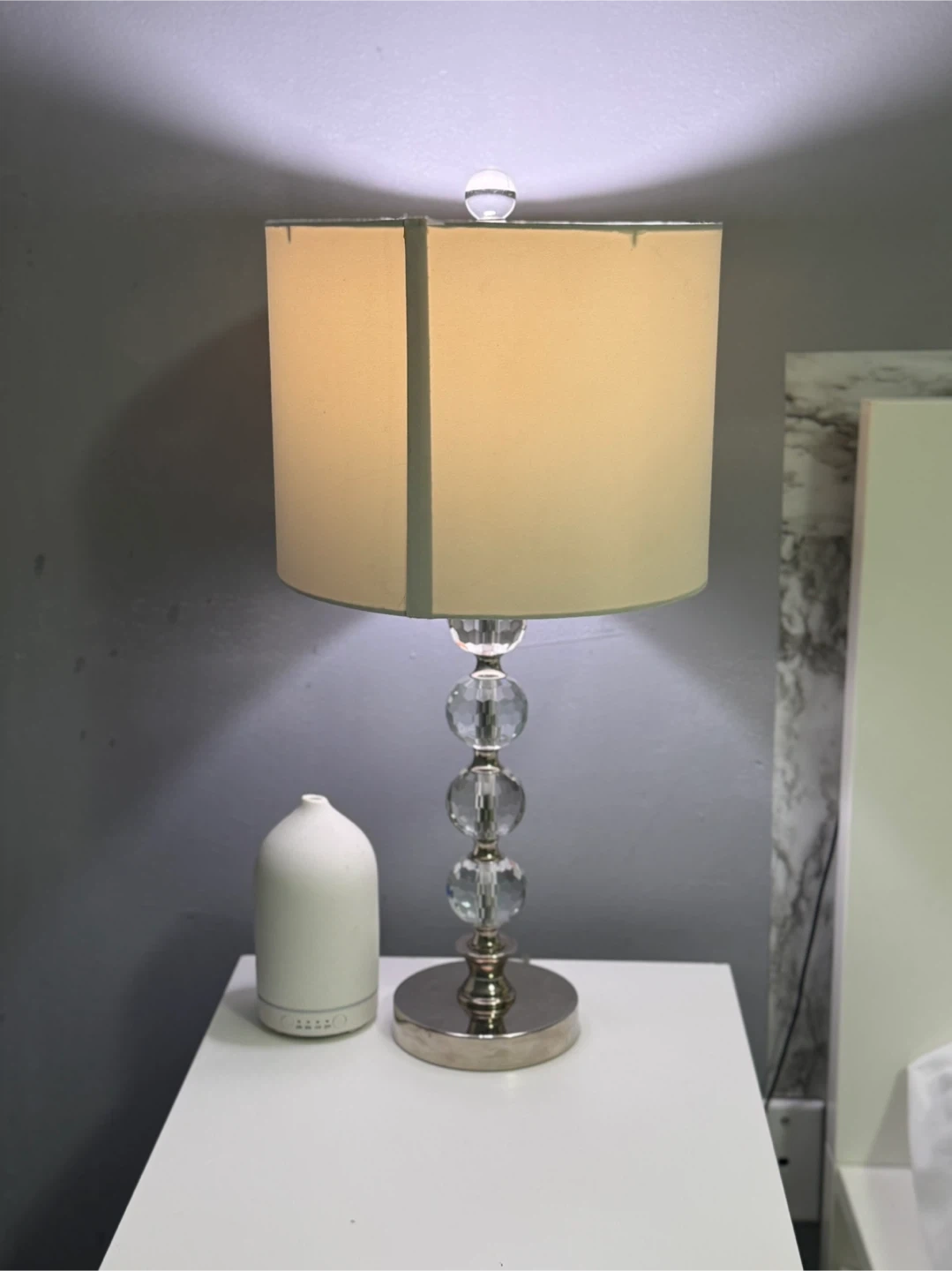 Stylish table lamp featuring a clear crystal bead accent and a beige fabric shade. It's perfect for adding a touch of elegance to your bedside or living room. Lamp base has a polished metallic finish.