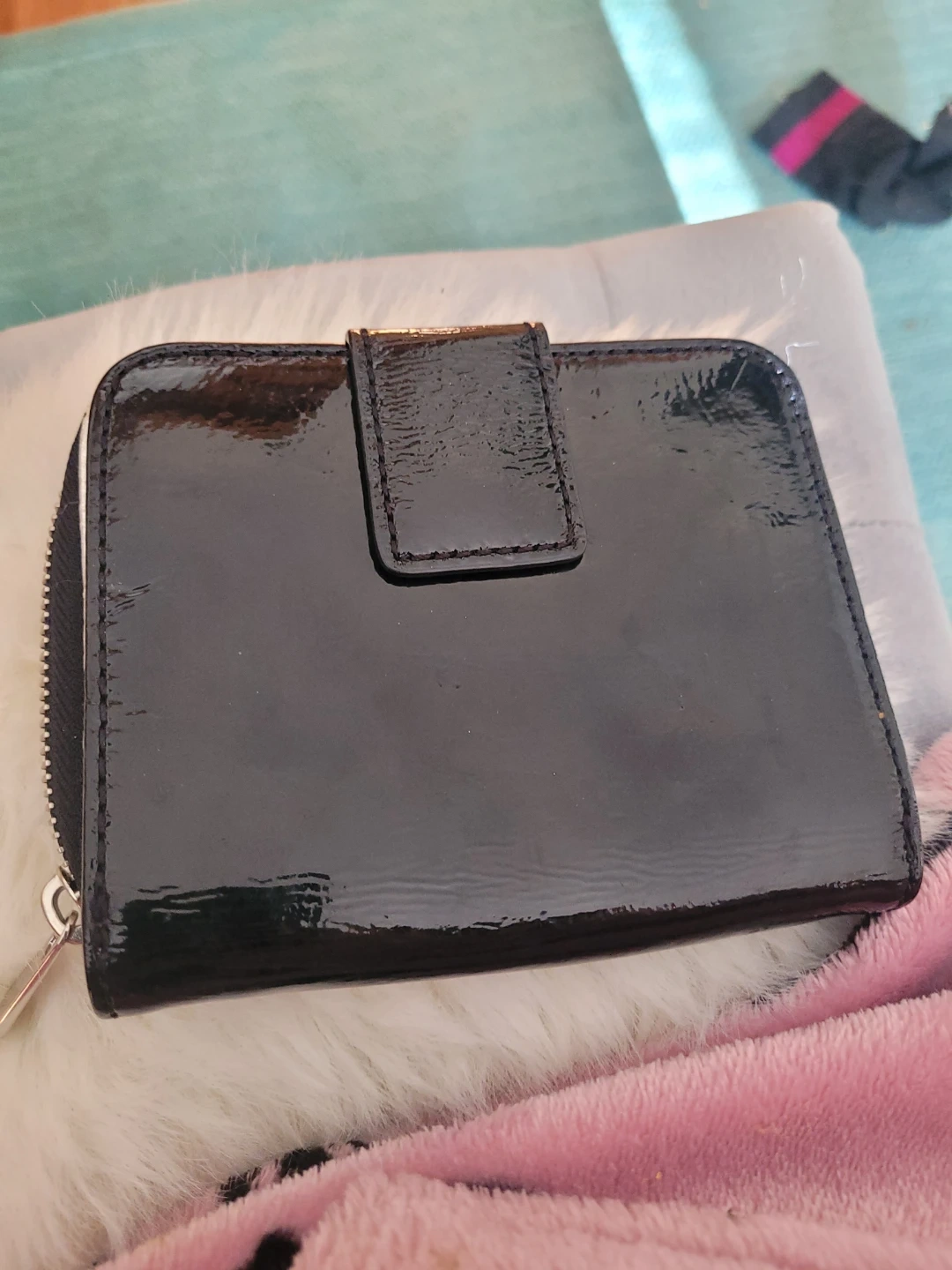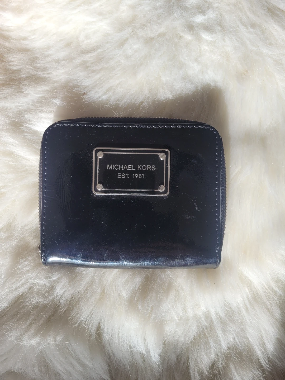 This Michael Kors wallet is black with a patent leather finish. It features a zip-around closure and multiple interior compartments for your cards and cash. The interior lining has the signature MK logo pattern. This wallet is a compact size for everyday use.