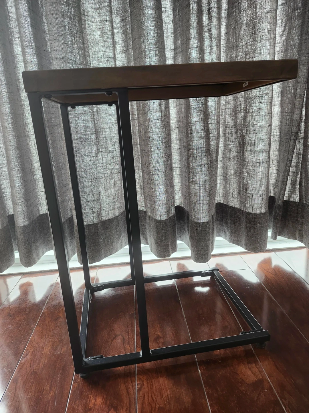 A C-shaped side table with a wood-grain top and black metal frame. It's a convenient surface for laptops or drinks. The frame has a modern, minimalist design.