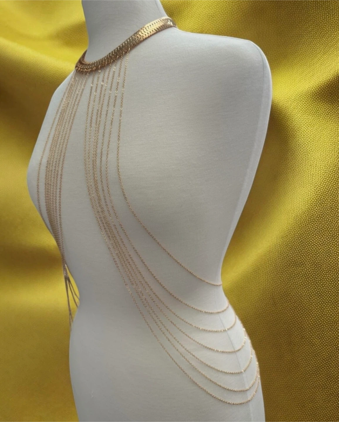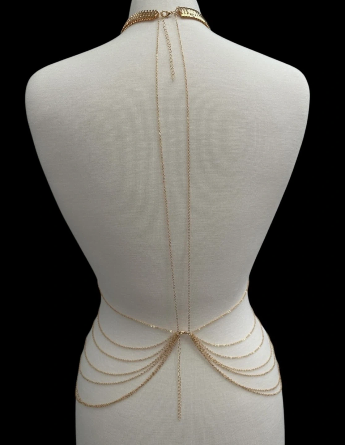This is a gold body chain, perfect for adding a touch of elegance to any outfit! It's in great condition and ready to wear