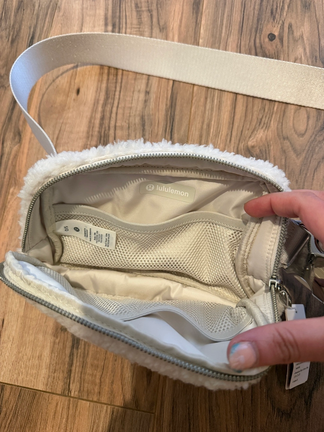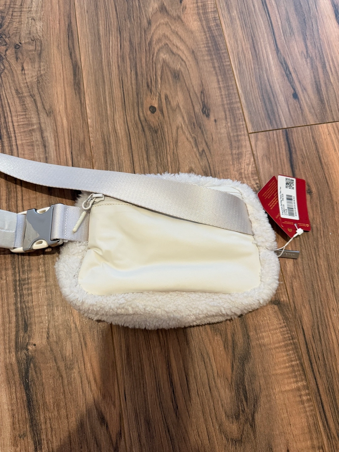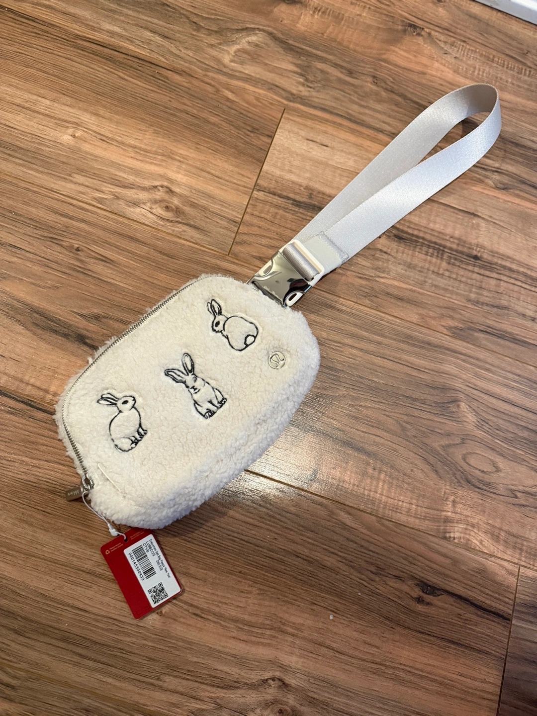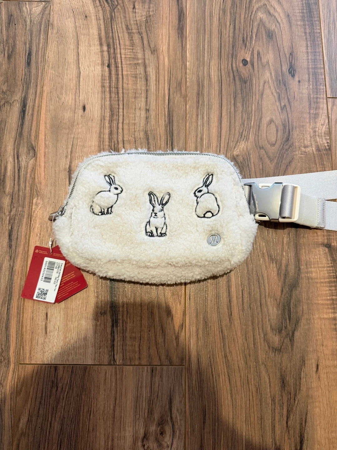 This Lululemon Everywhere Belt Bag 1L is fuzzy white with embroidered bunnies. It's got an adjustable strap and multiple interior pockets. Perfect for carrying essentials on the go!