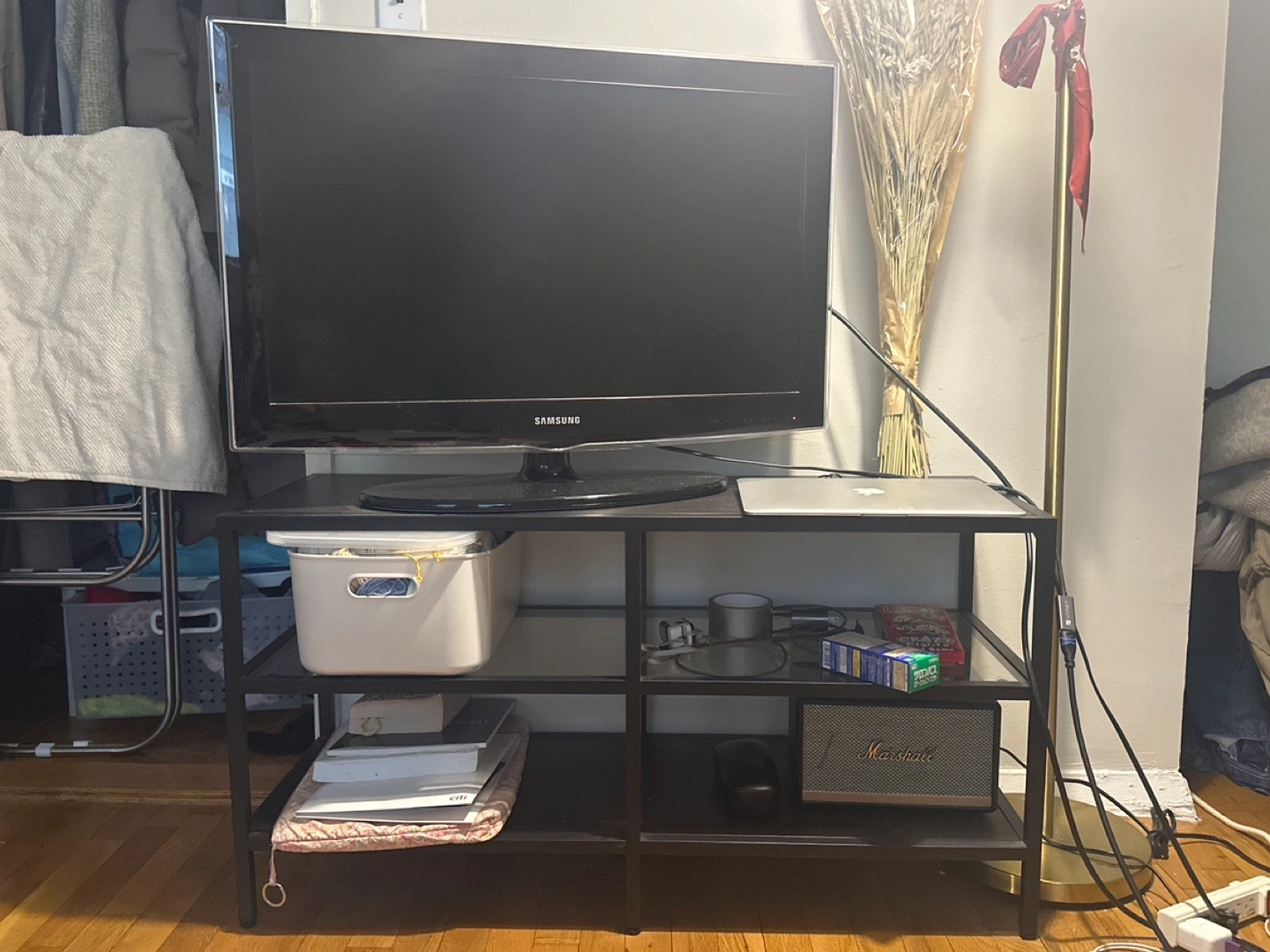 32 inch samsung monitor with glass shelves stand. Perfect fit for studio homes, works for playing games or streaming. $20 for tv and $20 for stand or $30 for both.
