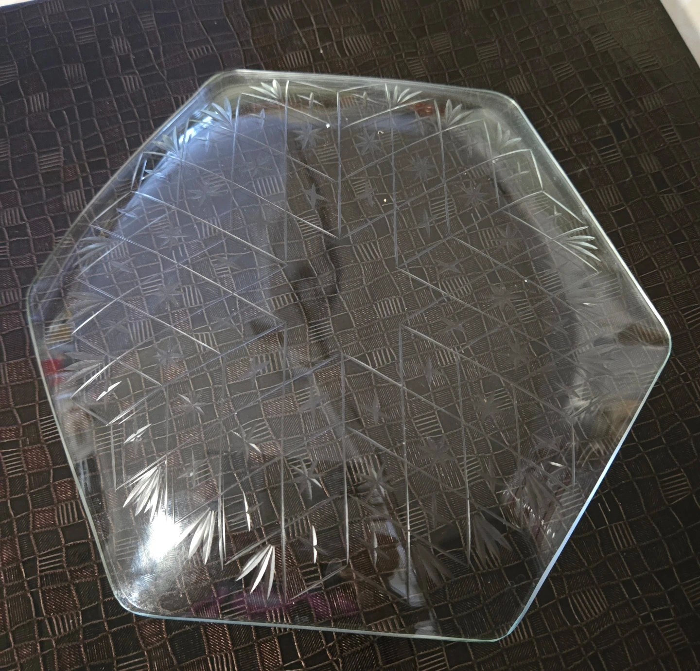 Set of five hexagonal glass plates. They feature an etched starburst and geometric pattern. These plates are clear glass. Use especially for Christmas celebration