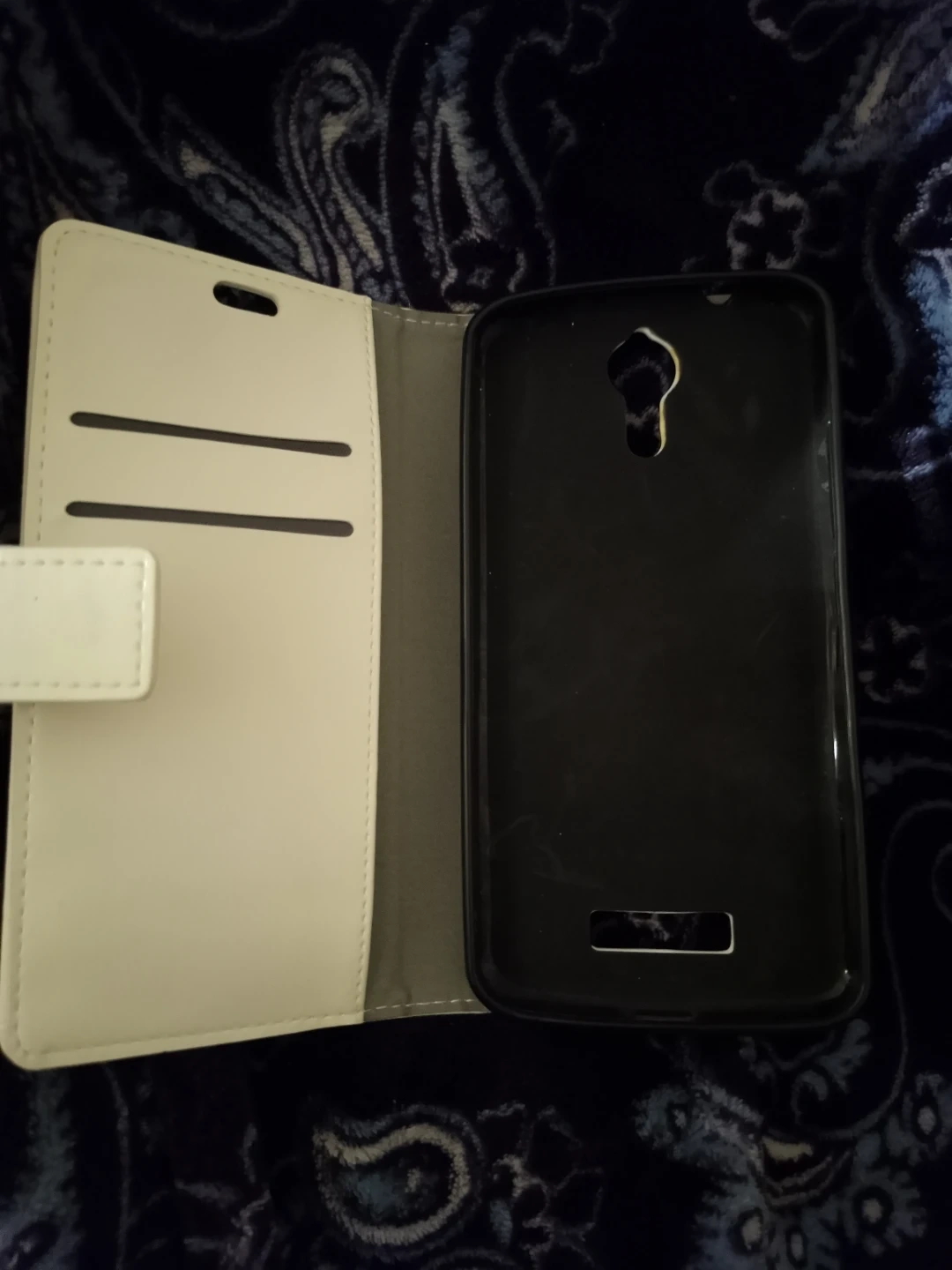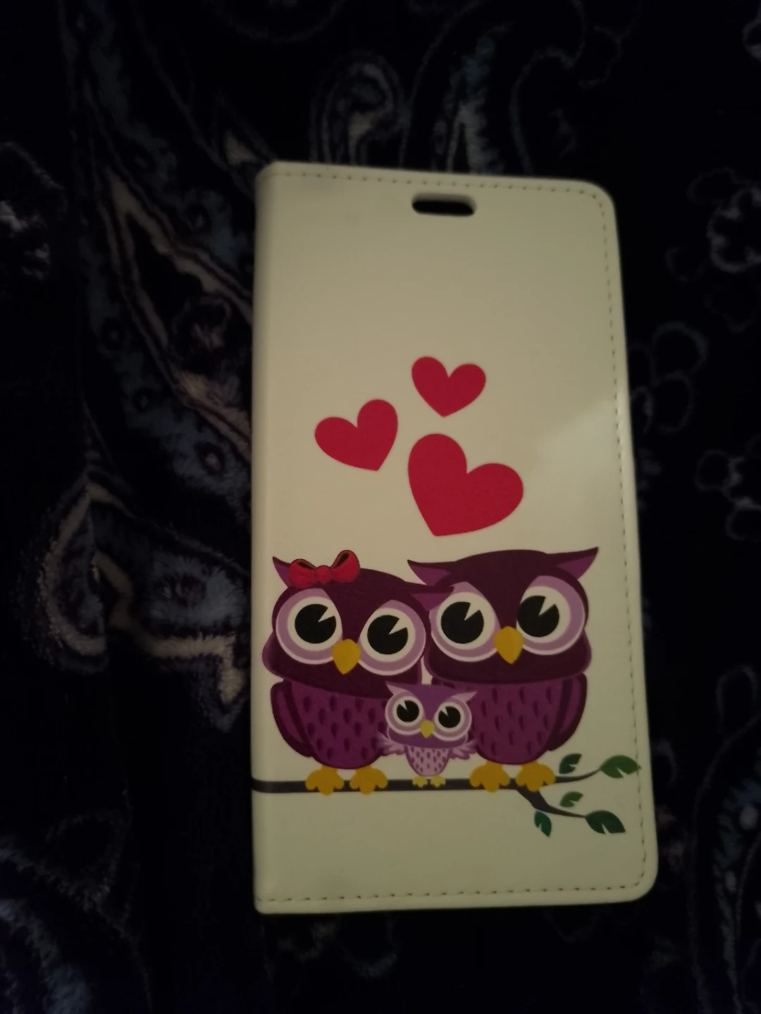 White flip case with a cute owl family design. It's a wallet-style case with card slots inside. Protects your phone in style!