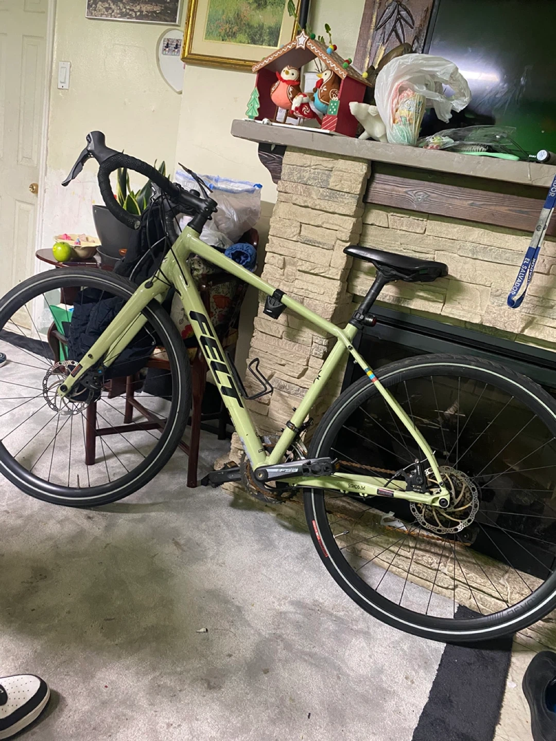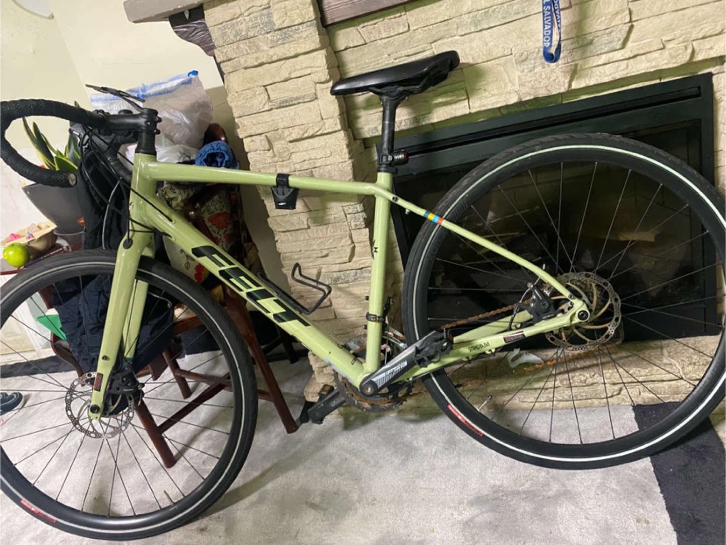 This is a light green Felt Breed gravel bike. It has disc brakes and drop handlebars. The frame has some scuffs but overall it's in good condition. It's ready for your next adventure!