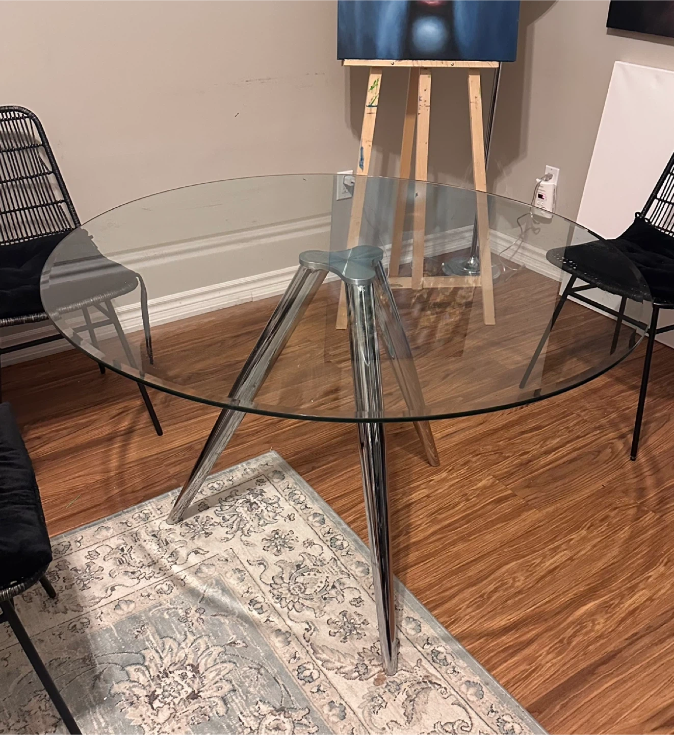 A round glass dining table with a stylish chrome base. It's a great size for smaller spaces.