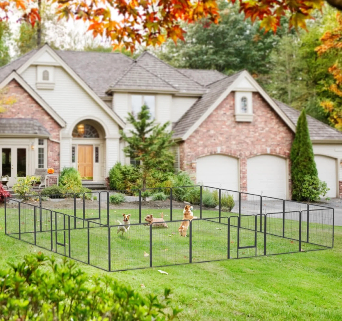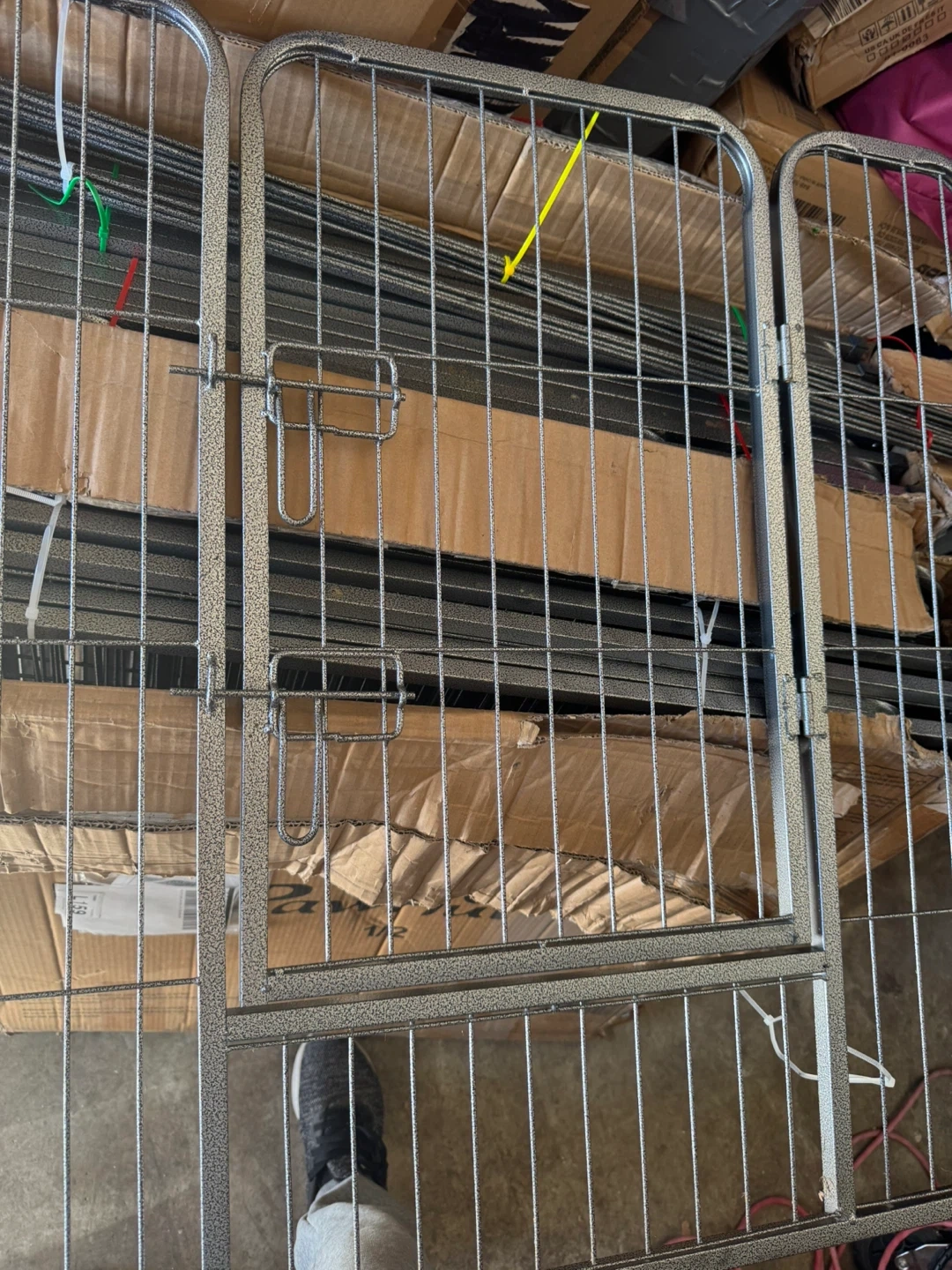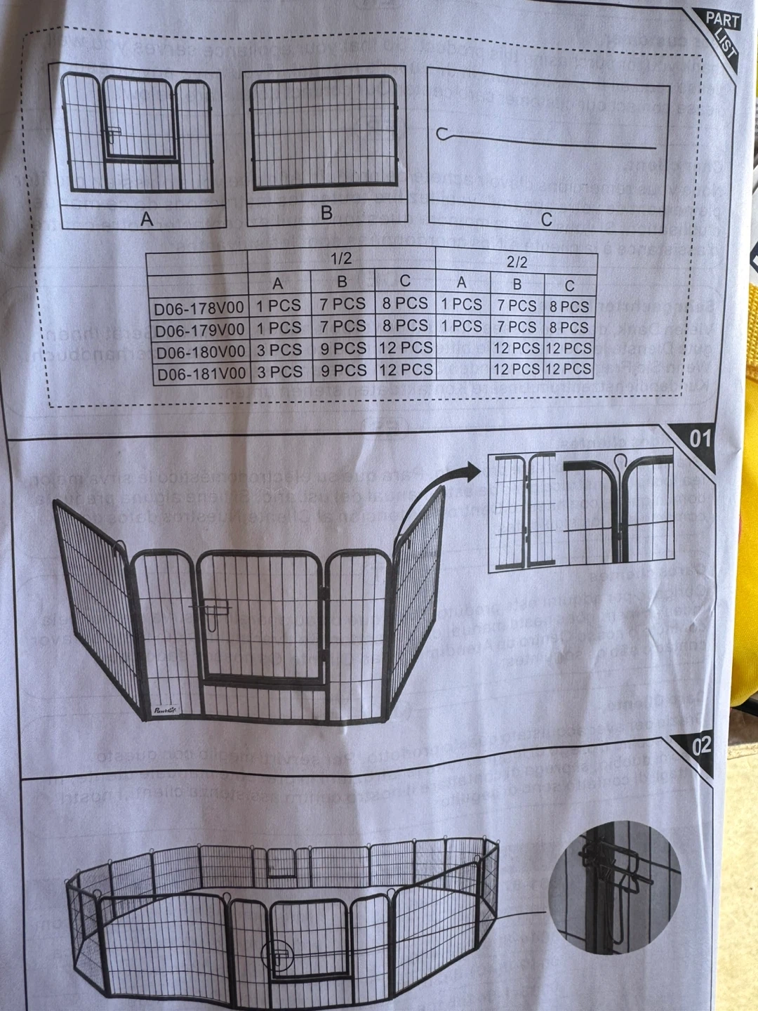 PawHut 24 Panel 31.5" Height Heavy Duty Dog Playpen for Small Medium Dogs, Grey NEW IN BOX MINOR SCUFFS FROM SHIPPING. MISSING 1 PANEL Dimension: Square: 189" L x 189" W x 31.5" H (480 x 480 x 80 cm). Rectangle: 252" L x 126" W x 31.5" H (640 x 320 x 80 cm). Single Panel Dimension: 31.5" W x 31.5" H x 0.6" D (80 x 80 x 1.5 cm). Assembly required. Made of 24 panels, you can change its shape to suit your room's layout, such as a rectangle, square, or L shape. Plus, it can be used as two dog fences for the yard separately if you need them. Indoors and Outdoors: The pet fence's surface uses a hammer paint technique, which offers great corrosion resistance and flatness. It shields your pups from scratches and comprises sturdy steel wires and tubes that withstand most weather conditions. Insert stakes into the ground to anchor the outdoor dog pen so that escape-artist pups cannot move it easily. Large enough for small and medium dogs, with a shoulder height of up to 19.7" (50cm). Including three step-through doors for easy access to and from the space. These robust latches keep your four-legged friends inside where they may play and rest secure from the outside world and potential room messes. PICKUP IN COURTICE NEAR HWY 2 AND COURTICE RD all sales are final