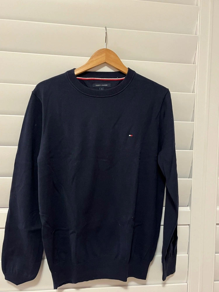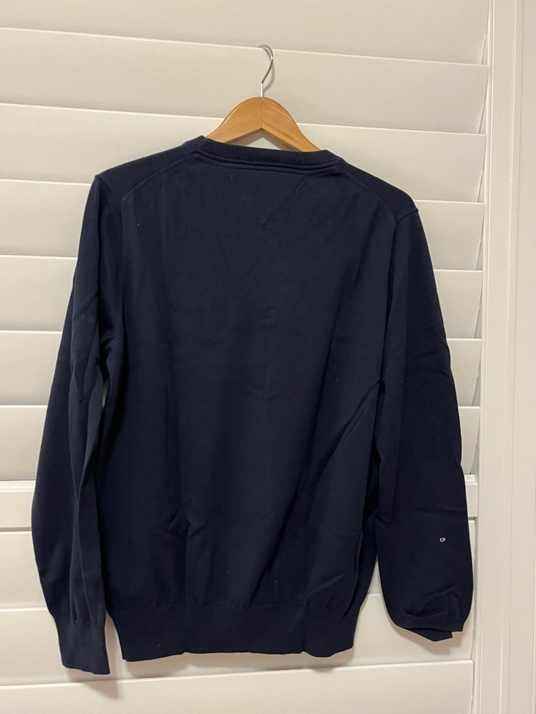 Men’s Tommy Hilfiger navy blue cotton crew neck sweater. Never worn. Size is MEDIUM.