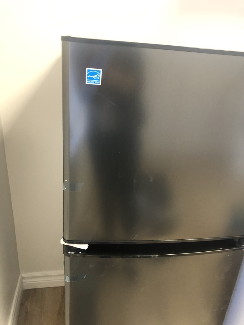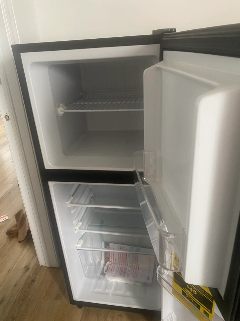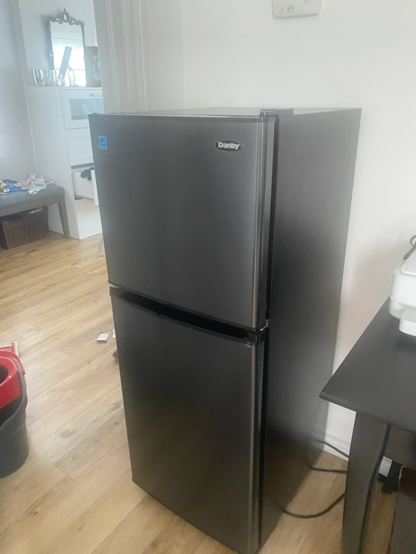 NEW DANBY 4.7 cu. ft. (133L) capacity compact refrigerator Eye-catching Black Stainless Steel look Separate freezer section (1.5 cu ft.) Energy Star® Compliant One wire shelf in freezer Two full width glass fridge shelves Vegetable crisper with glass cover Integrated door shelving with tall bottle storage Interior light Mechanical thermostat Manual defrost Reversible door hinge.