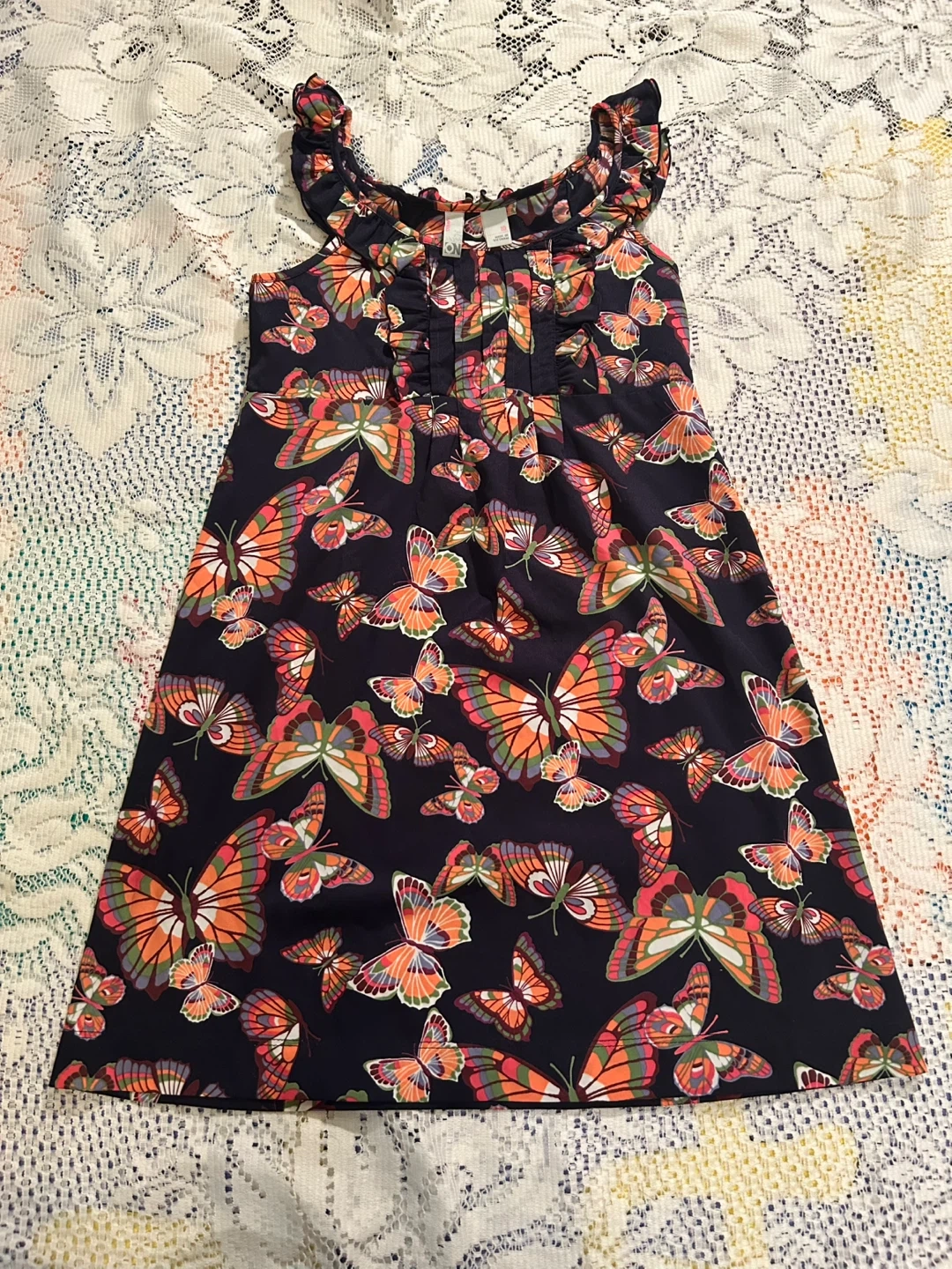 This is a Lalique girls' dress with a colourful butterfly print. It's a size 10 and made in Vietnam. Features ruffled trim along the neckline and straps.