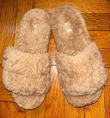 For sale are a BRAND NEW pair of UGG Cozetta Curly chestnut brown sheepskin sandals. Pamper your feet with the soft, cozy, real sheepskin lining. Nonslip rubber outsole. Size 9. (Style #1130838) Hologram logo on tag - guaranteed authentic. Never worn. MSRP: $100. Yours for $60. Pick up on the Upper West Side of Manhattan.