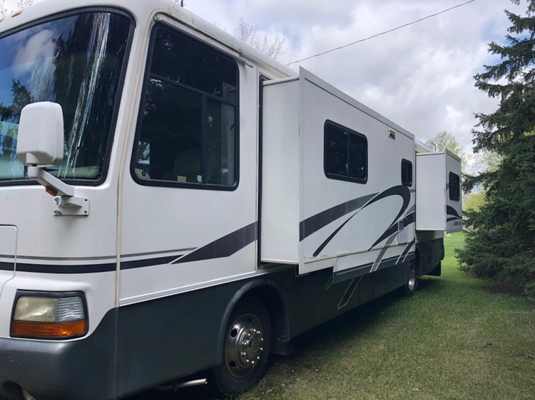 2001 Newmar Kountry Star Model KSPD 3667 Freightliner Chassis Diesel Pusher, Cummins ISB 300 HP, Allison 6 speed Automatic transmission. Air Brakes, Jake brake, Unit has Cummins Onan LPG 5500 watt generator (< 40 hrs run time), 400 watt inverter, two (2023) 12-volt chassis batteries; two (2023) 6-volt deep cycle house batteries. 81,500 km. The unit has a solar panel battery charging system currently set to charge the house batteries. Four solid stabliizer jacks controlled at the driver’s station. New (2024) alternator and wiring harness, new rear air brake modulator (fall 2023), full storage basement. The unit can easily handle any towed vehicle you wish to pull. The unit has been Quonset stored (winter) for the past 10 years.
