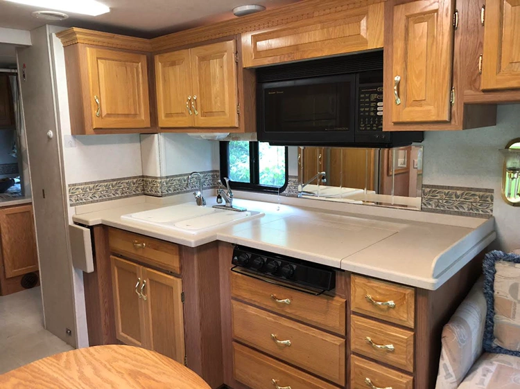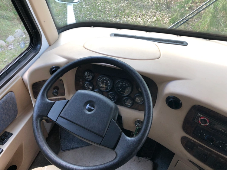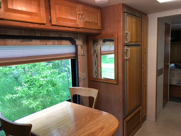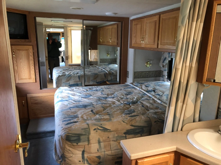 All cabinetry is solid oak finished. The Motorhome has two TVs one at the front and a small TV in the bedroom area. The front TV has replaced the original.